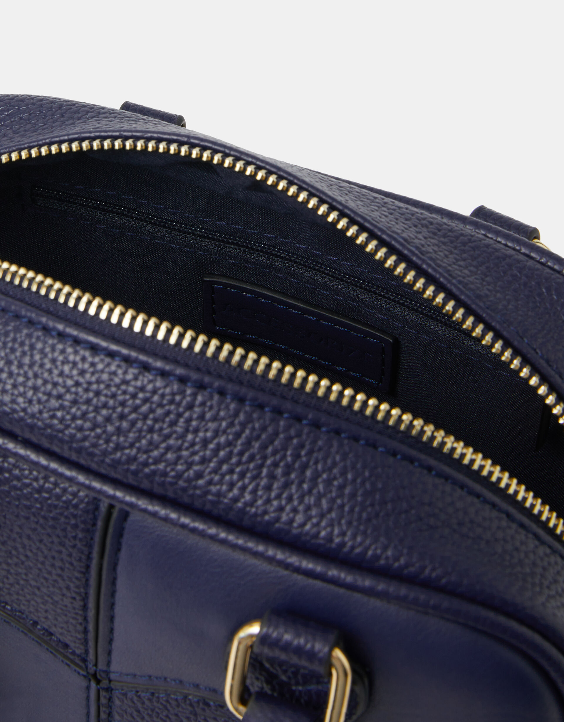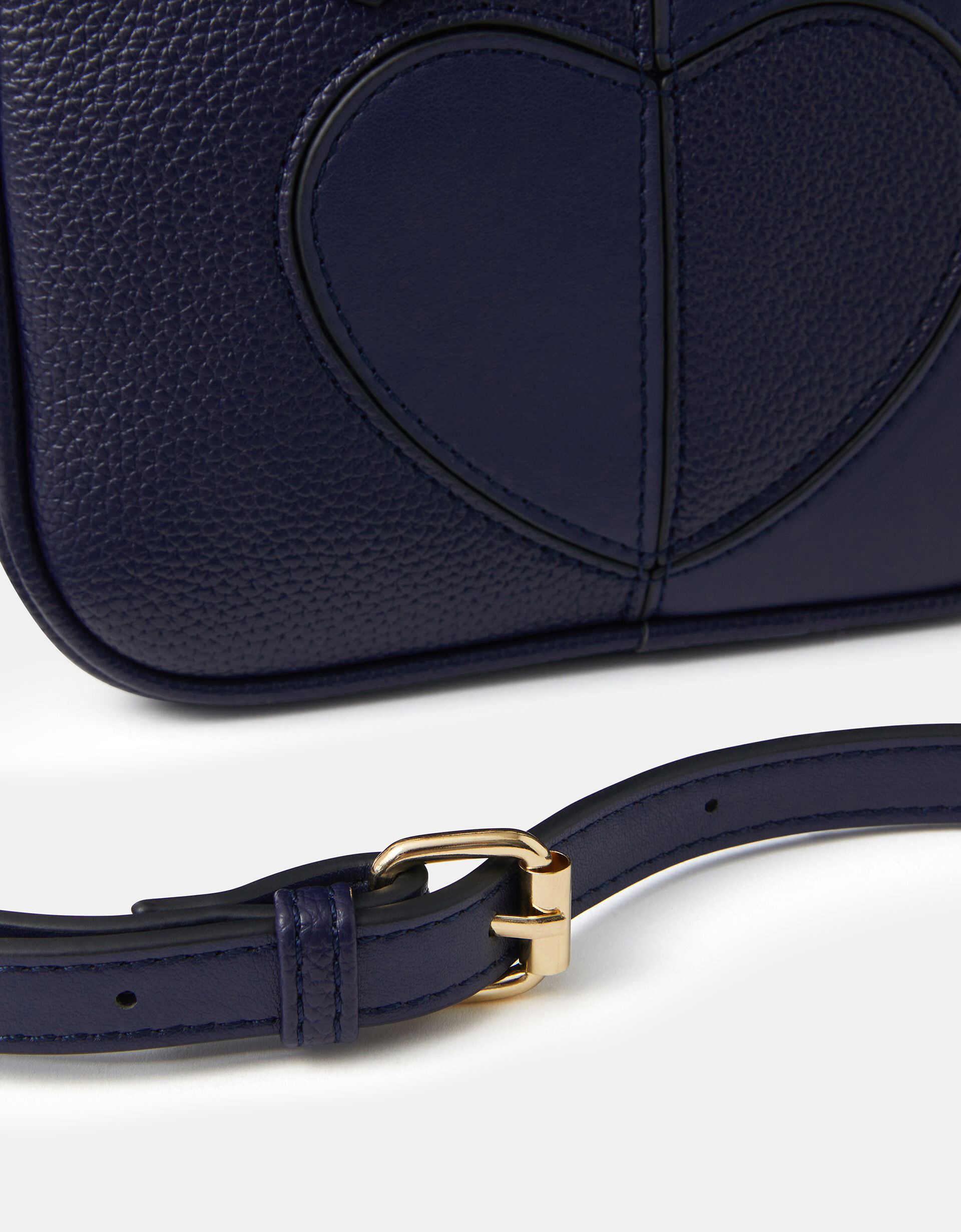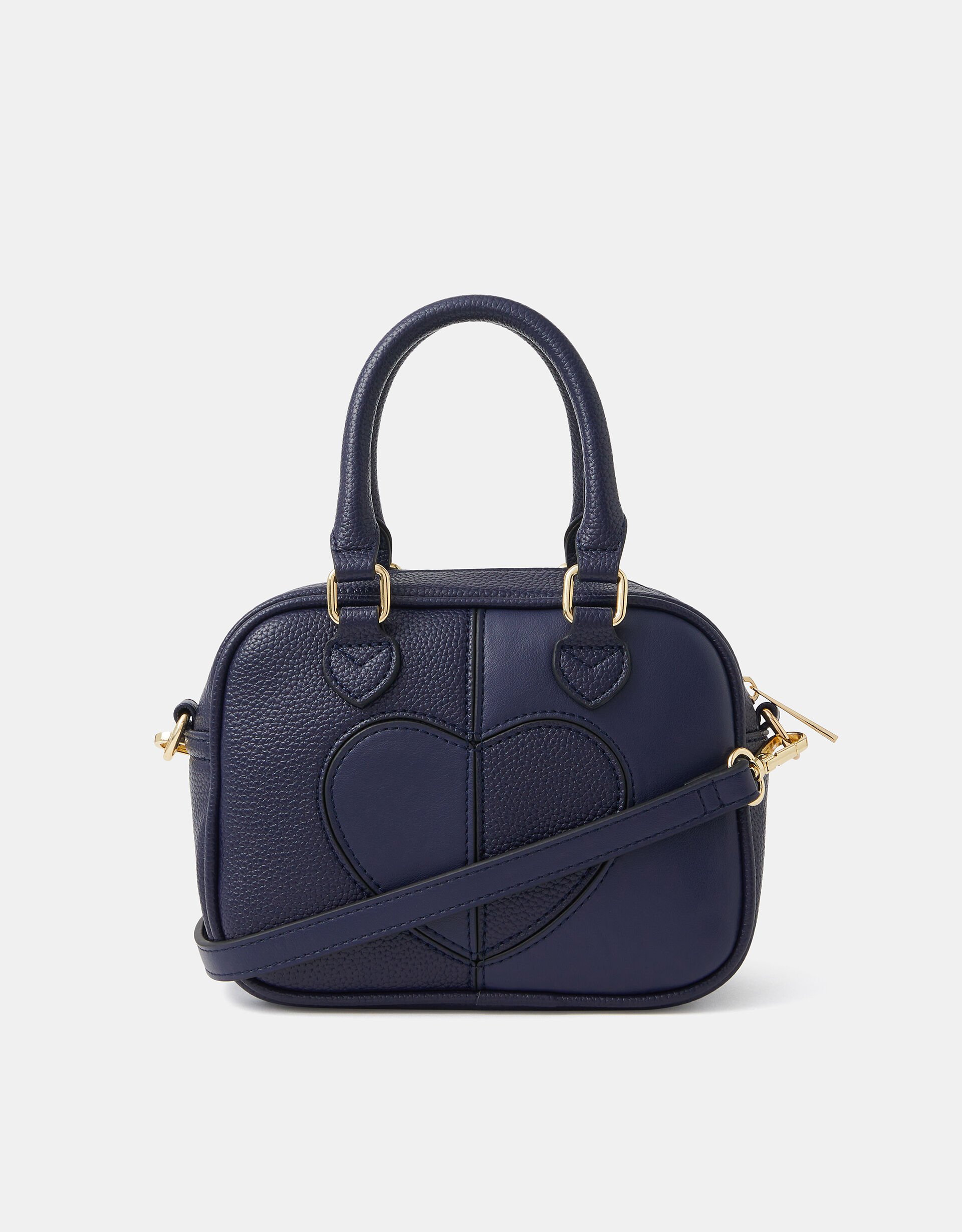 Crafted with faux leather, this bag features a cute heart patch to the front. Designed with two sturdy top handles, a detachable crossbody strap and secure zip fastening to house all your goods. Matching pouch available. Blue