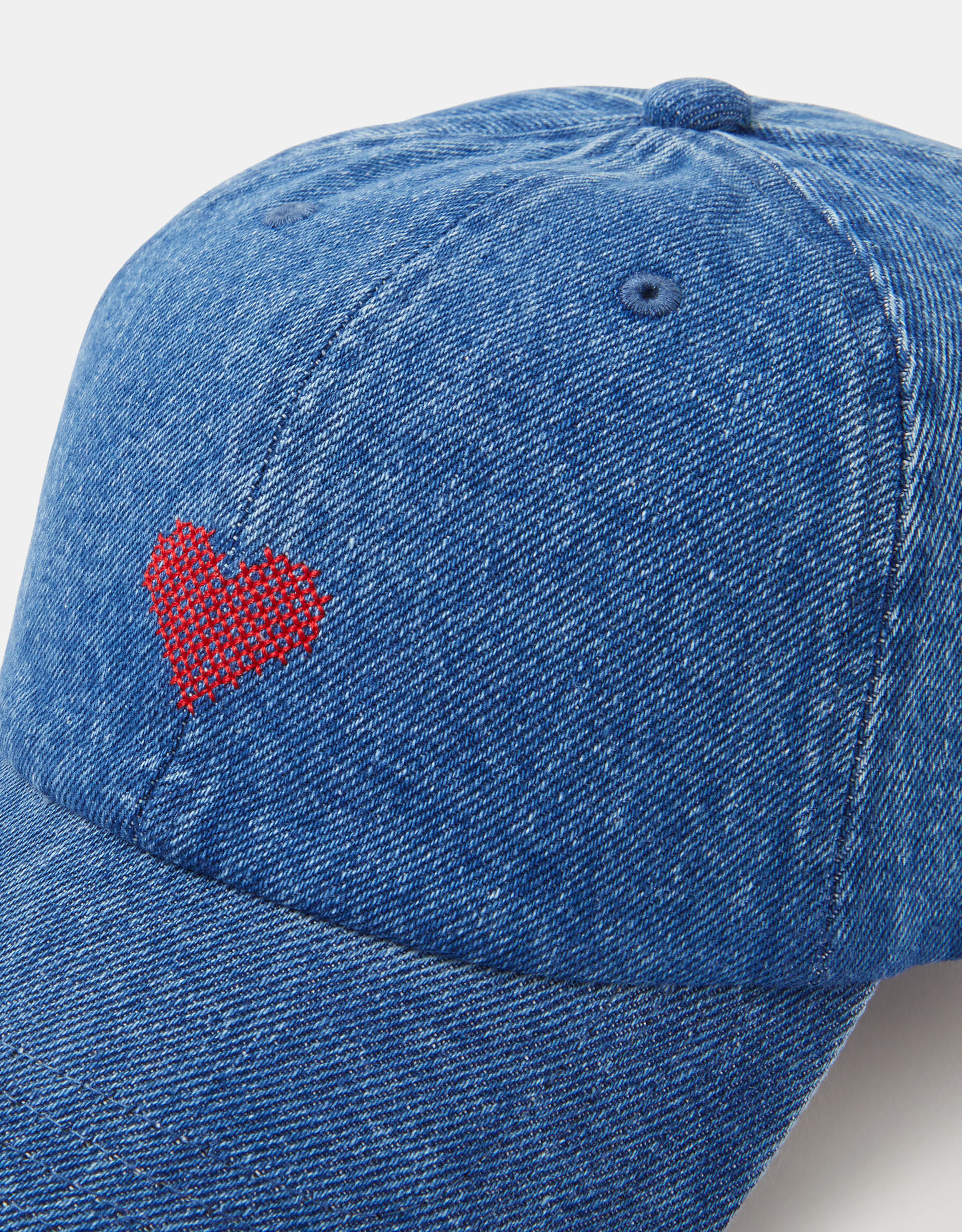 Rain or shine, this cap is a love-ly finisher to all your weekend looks. It’s designed in blue denim and stitched with a red tapestry heart above the curved brim.