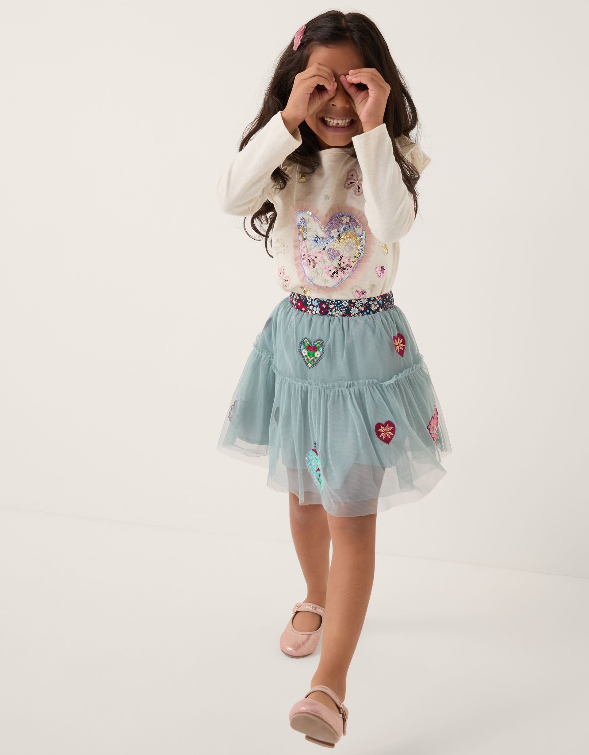 Cute as a button. A playful piece for little ones who love to sparkle all day long. Designed in duck egg tulle, this skirt is embroidered with decorative hearts and sequin embellishments in colours to match the stretchy floral waistband. Green