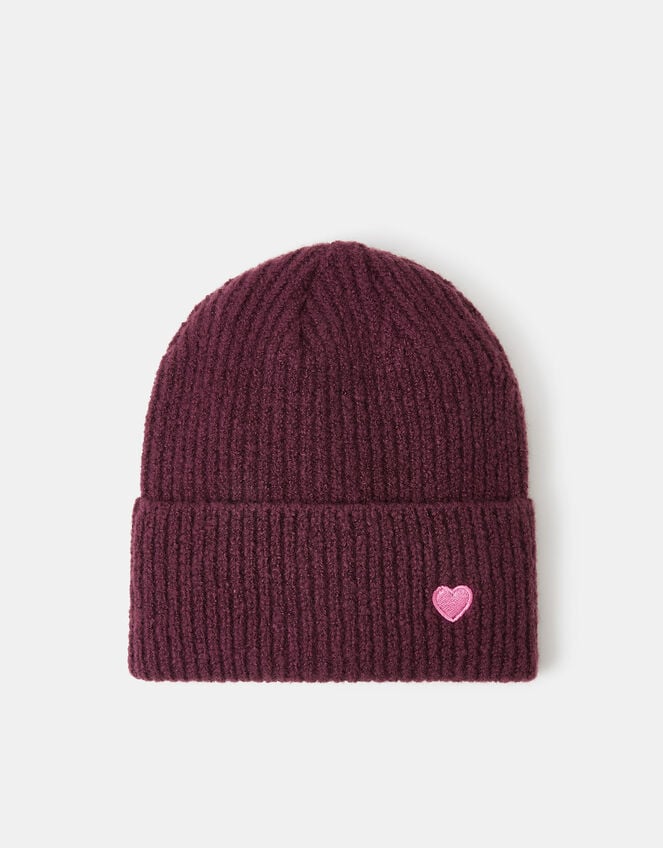 Reasons to love a beanie hat: Keeps you warm in wintertime whilst being a quick fix to cover any bad hair days. Stitched with a soft blend in a dreamy burgundy colour, this beanie has a ribbed finish, turned-up brim and pink embroidered heart patch to the side.