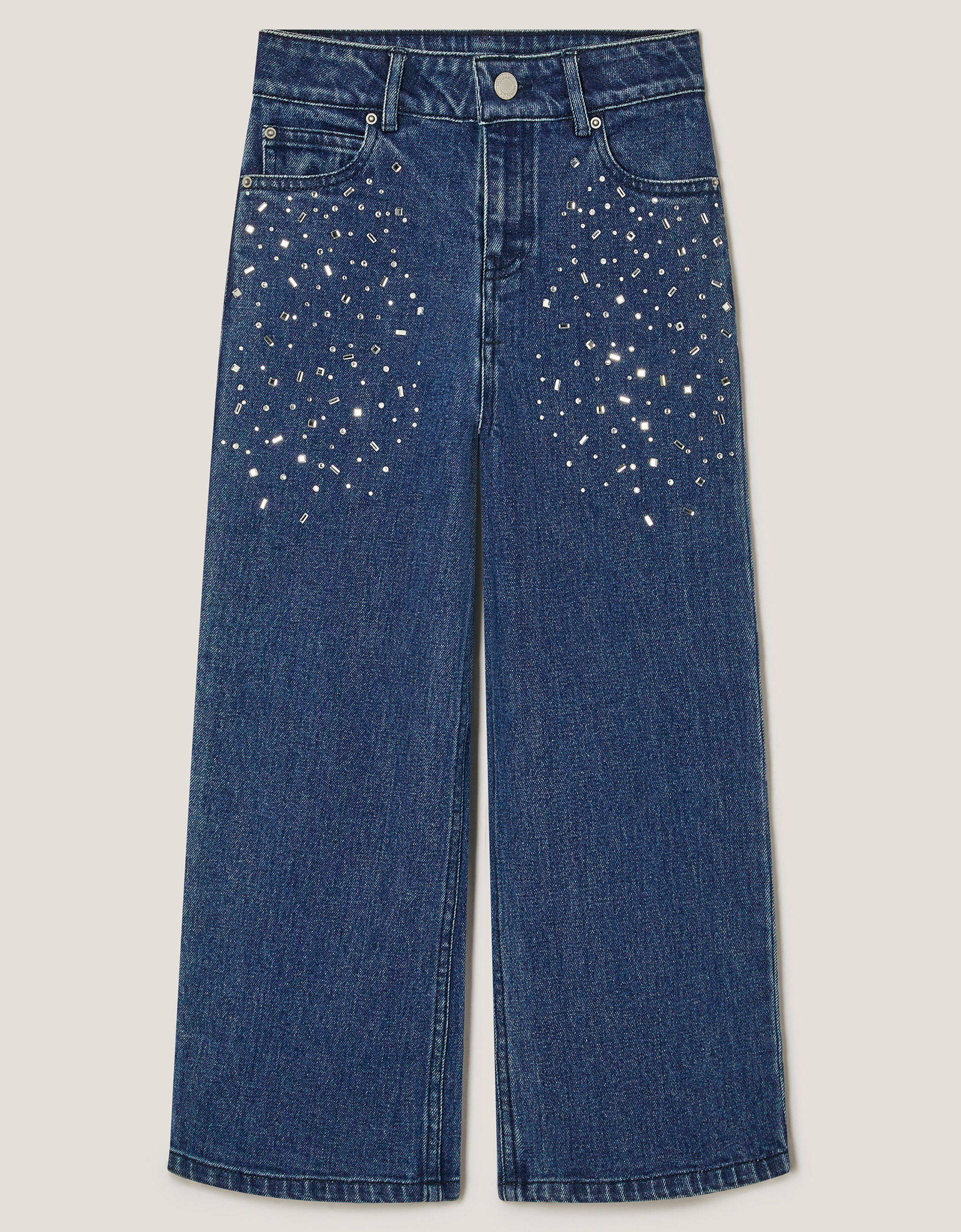 Party-proof denim! Soaked in a blue wash and bejewelled with silver rhinestones and gems, these wide leg jeans are a fun pick for little ones who love a little sparkle. Features a classic front button and zip fastening with five-pocket styling. Blue