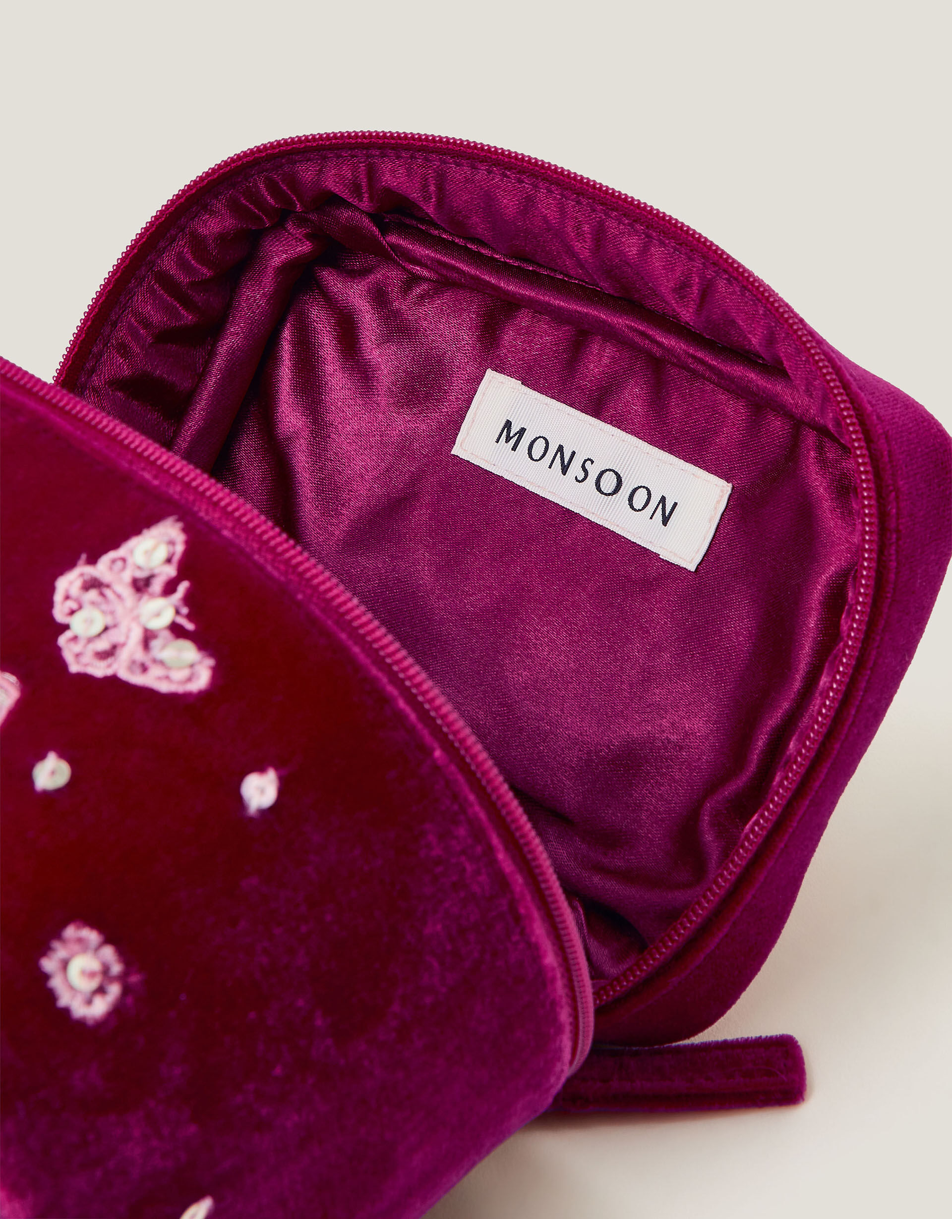 Glam essentials. Adding a personalised touch to gifting, this make up bag makes the perfect present for any occasion. It’s designed in soft velvet with embroidered butterflies, florals and an initial of your choice. Red