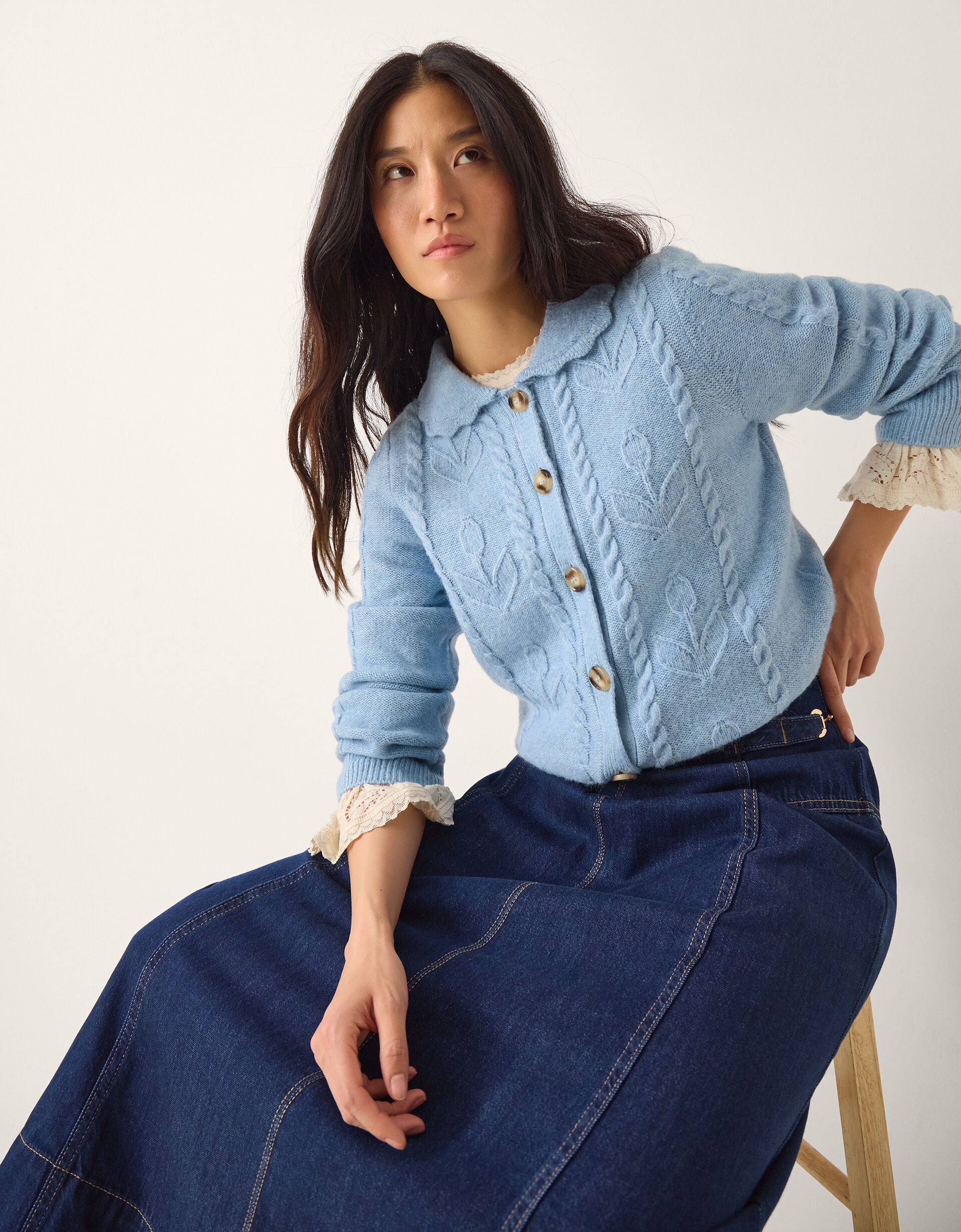 This one’s got everything. Along with cable knit detailing, this cardigan features tulip designs, a scallop edge collar and chic tort buttons. Crafted from a cosy blend, it’s just the thing to slip on for coffee dates and in-office days. Blue
