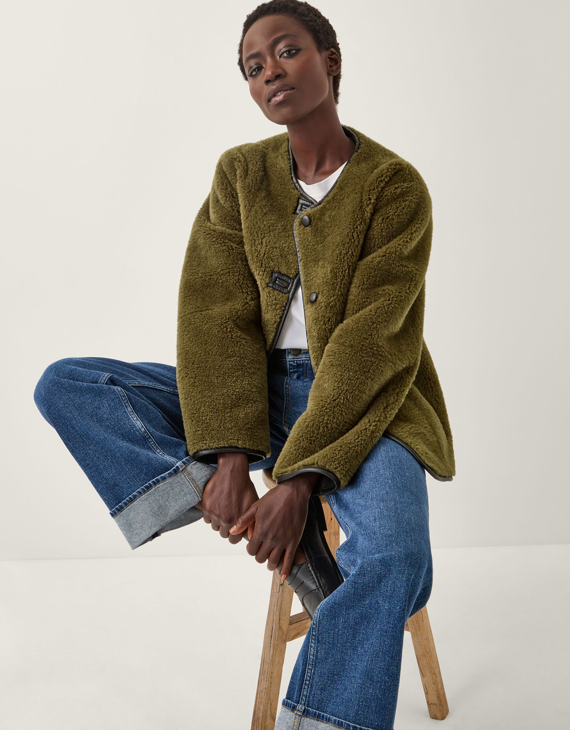 Brrr! Snuggle up with a (faux) fur jacket this chilly season. Designed with black accent buttons, cuffs and neckline, it’s a chic choice for coffee dates and in-office days. Dress down with a tee and denim or jazz up with a patterned skirt for ultimate autumnal vibes. Green