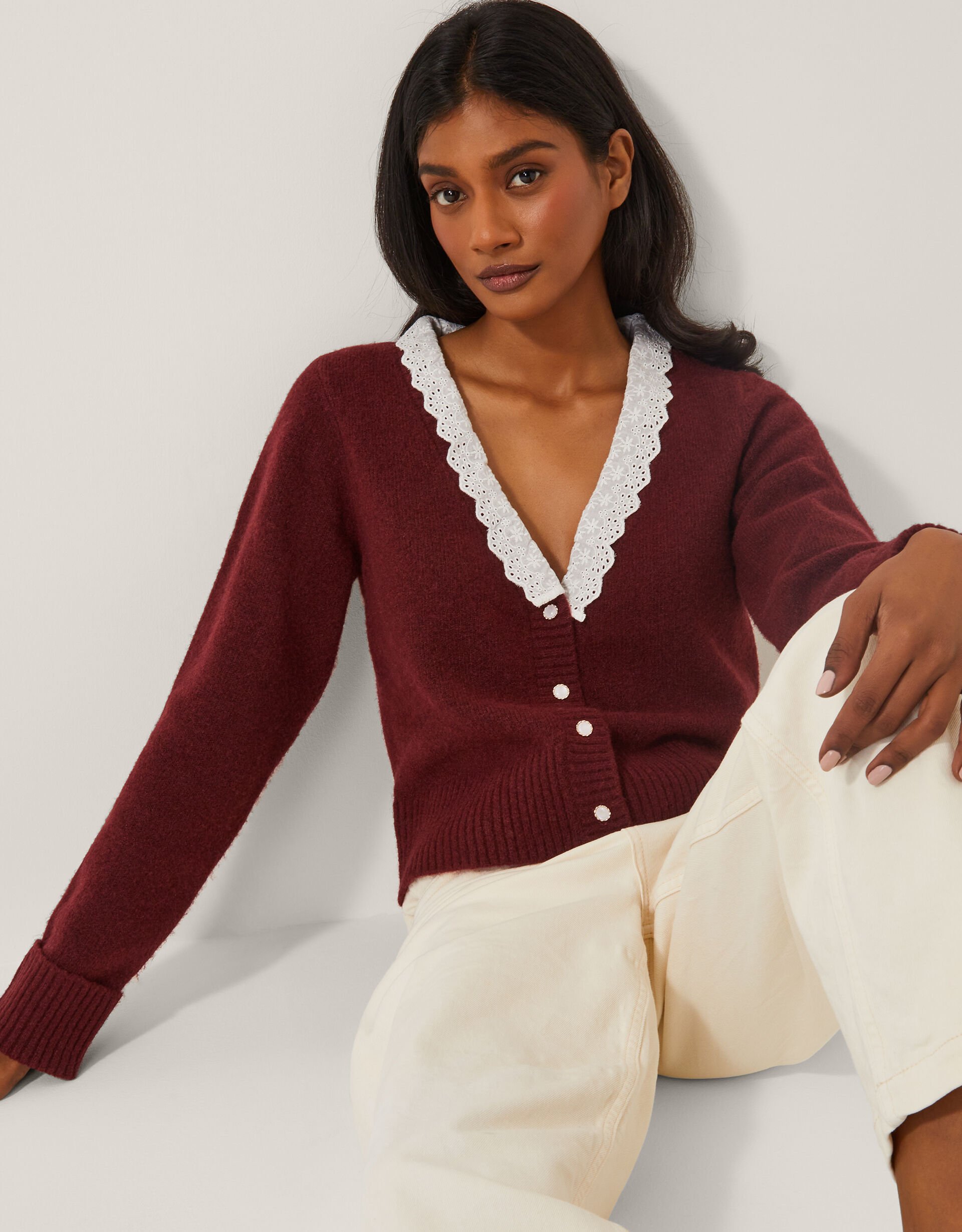 A little frill goes a long way. Offering cosy cottagecore vibes, this cardigan is stitched with a V-neckline framed with scalloped broderie trim. Finished with turned-up cuffs and pearly gold button fastenings. Red
