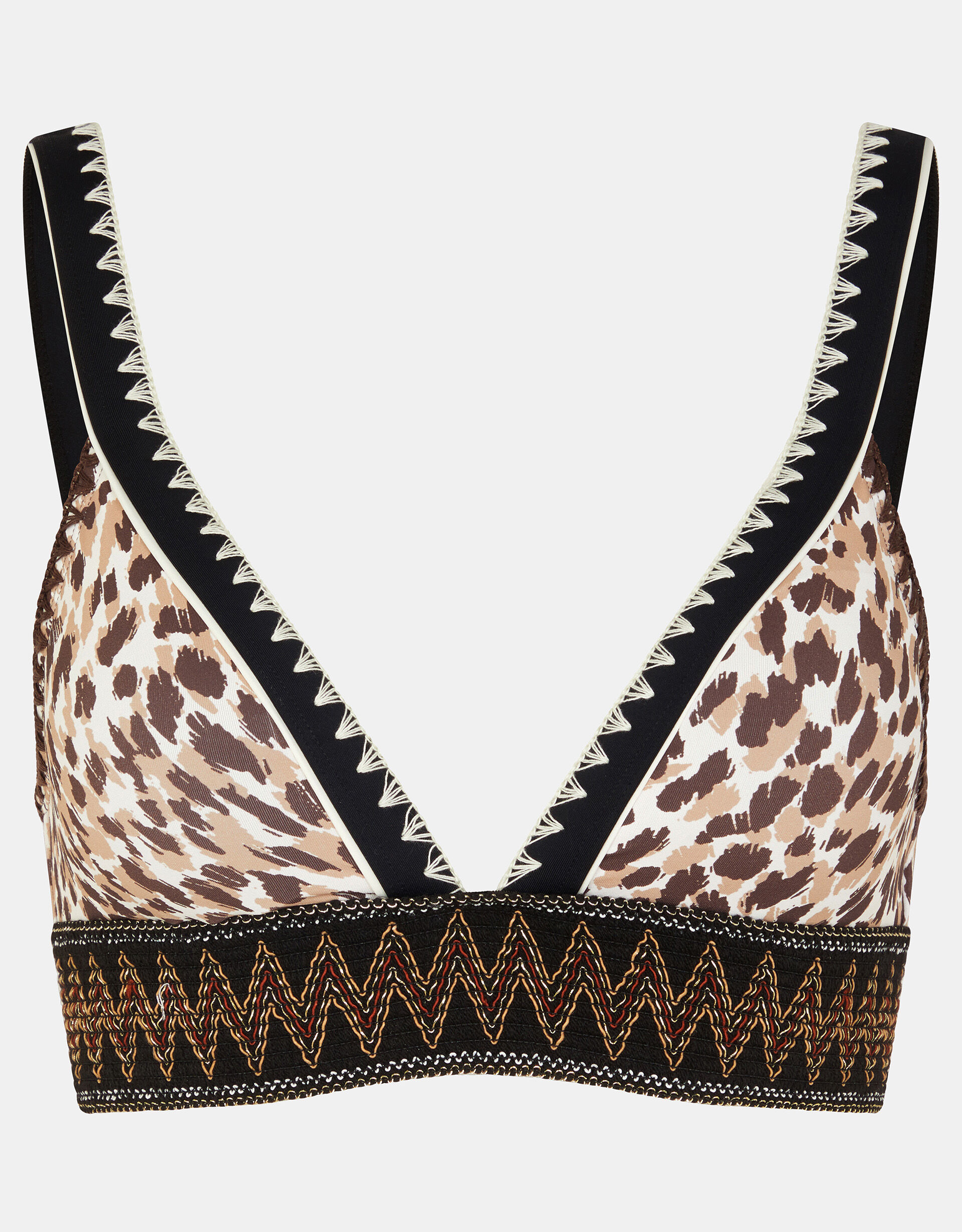That summer feline… Shaped with a plunging neckline and stretchy under-bust band with zigzag patterns, this bikini top features leopard spots in classic neutral tones. Matching bikini bottoms available. Brown