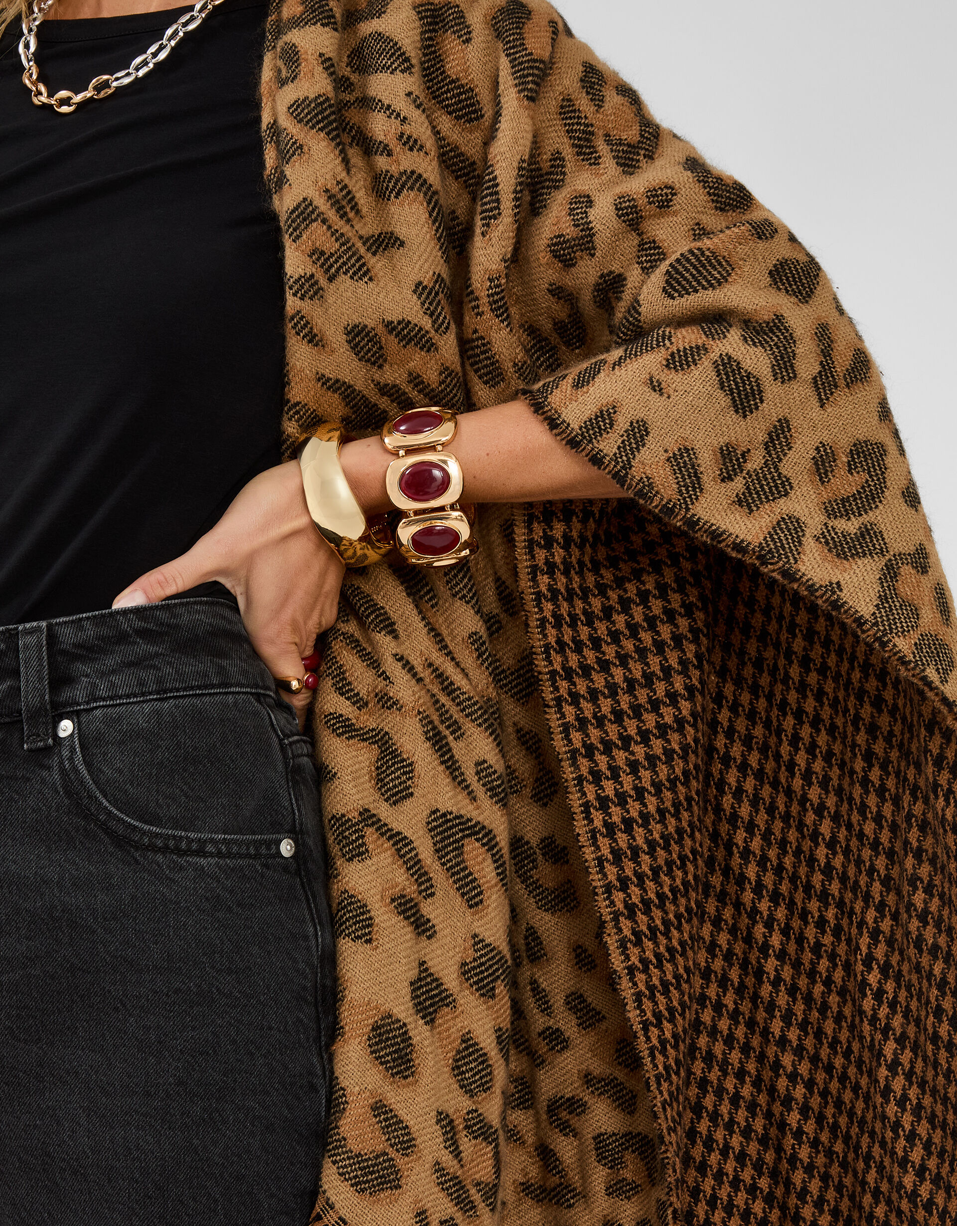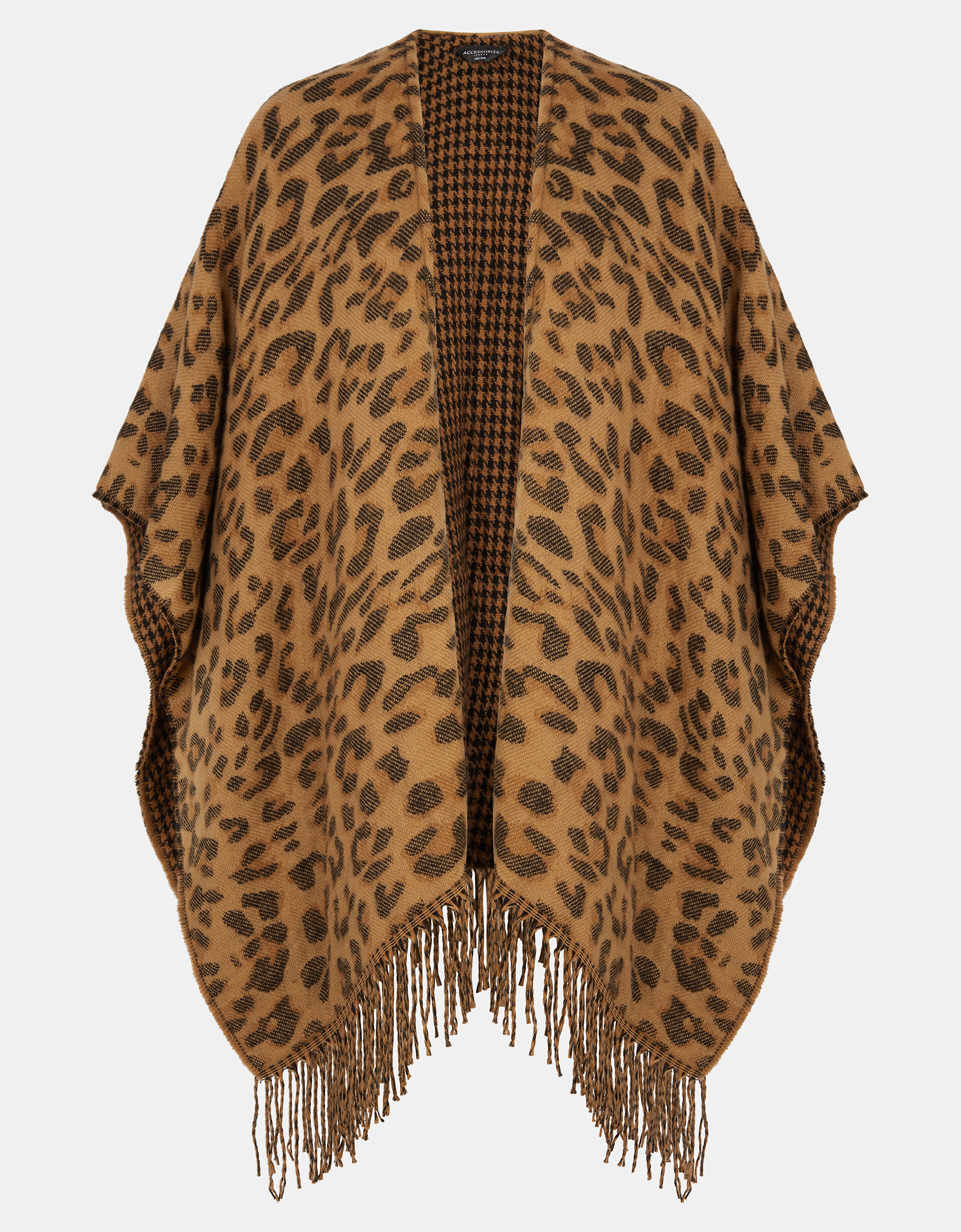Styled in the wild. Cosy yet lightweight, this leopard print poncho is the perfect layer for any season. Finished with houndstooth lining and fringe detailing.