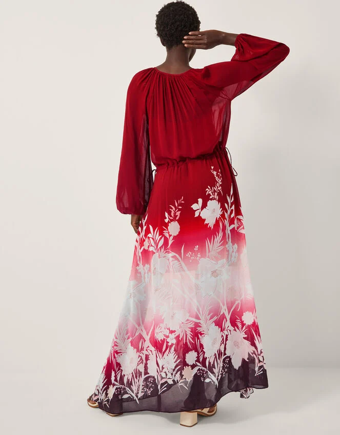 The perfect all-occasion dress you can always rely on. Soaked in a dreamy ombré finish and patterned with statement florals, this number is designed with long blouson sleeves and a slit on the side. Red