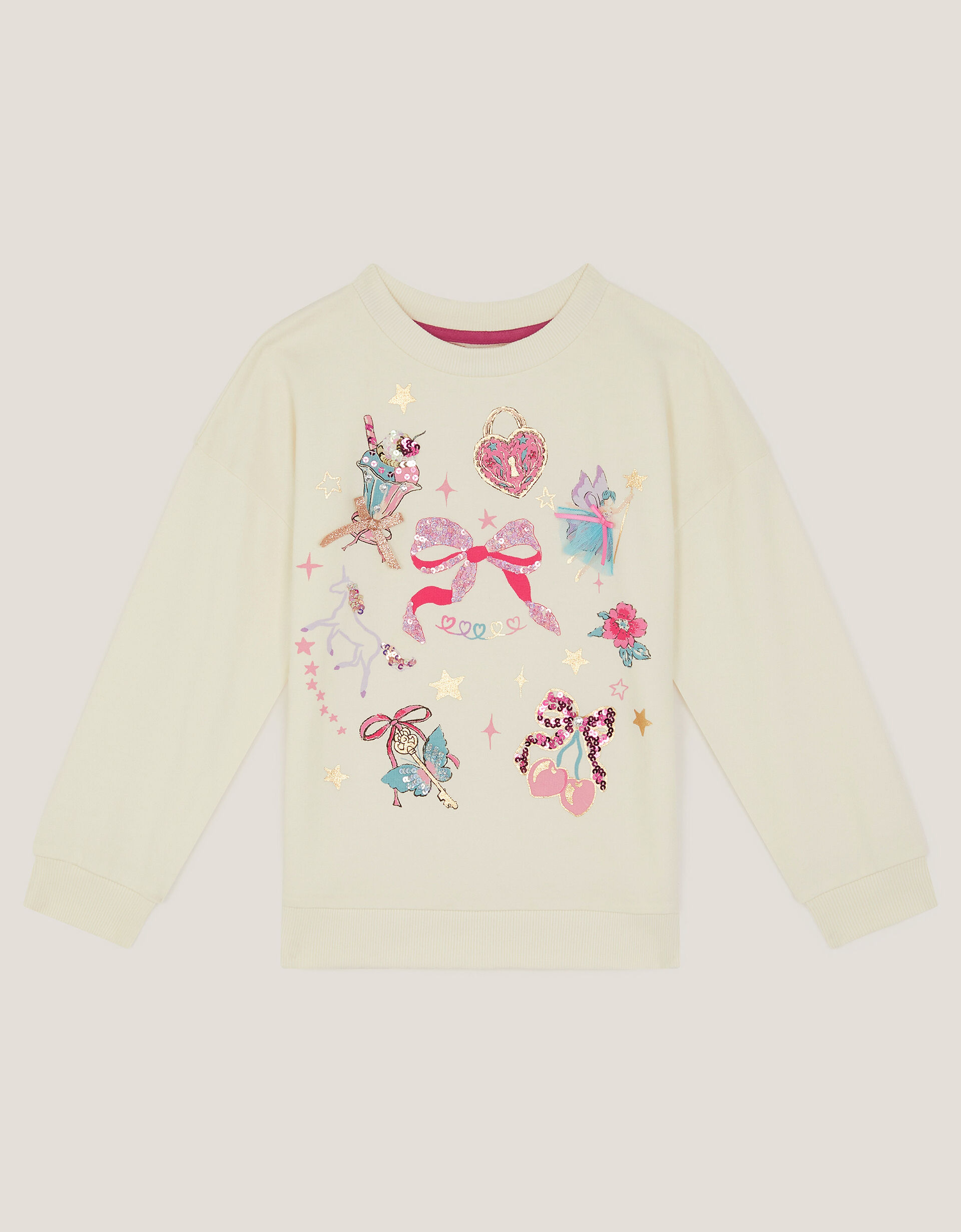 These are a few of their favourite things… Comfort meets cute, this sweatshirt is made from super-soft cotton with a sparkly pattern of unicorns, bows, milkshake, fairies and stars for a magical finish. *Adds to their outfit rotation immediately*. Ivory