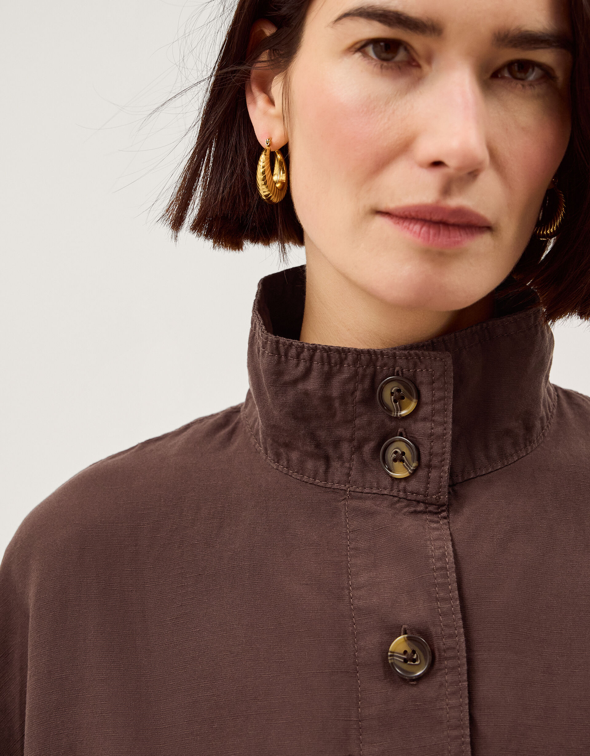Dress deliciously. Dipped in a chocolate tone, this jacket is perfect for transitional weeks when it’s not quite warm enough to leave home without one. Whisked from a lightweight linen blend, it’s designed with an optional funnel neck, cropped sleeves and endlessly chic tort buttons. For extra cinch and shape, there’s also an adjustable tie at the hem.