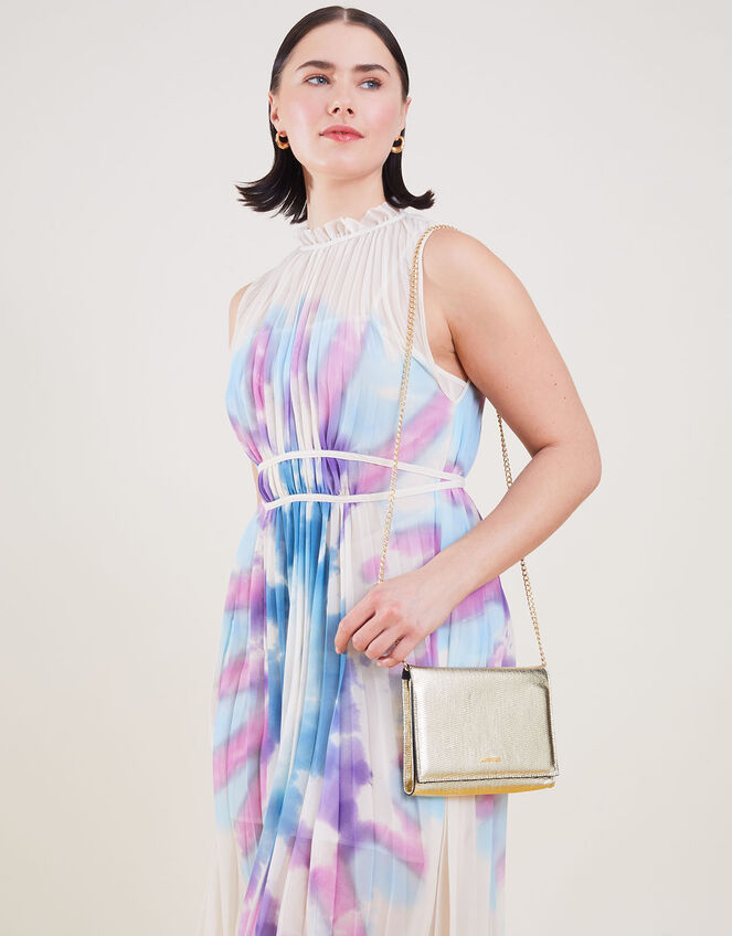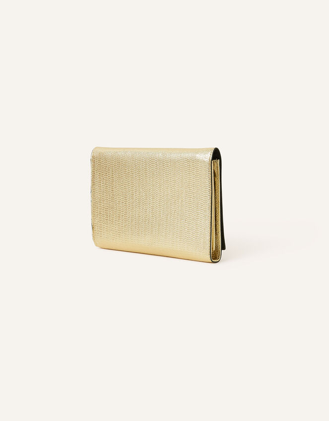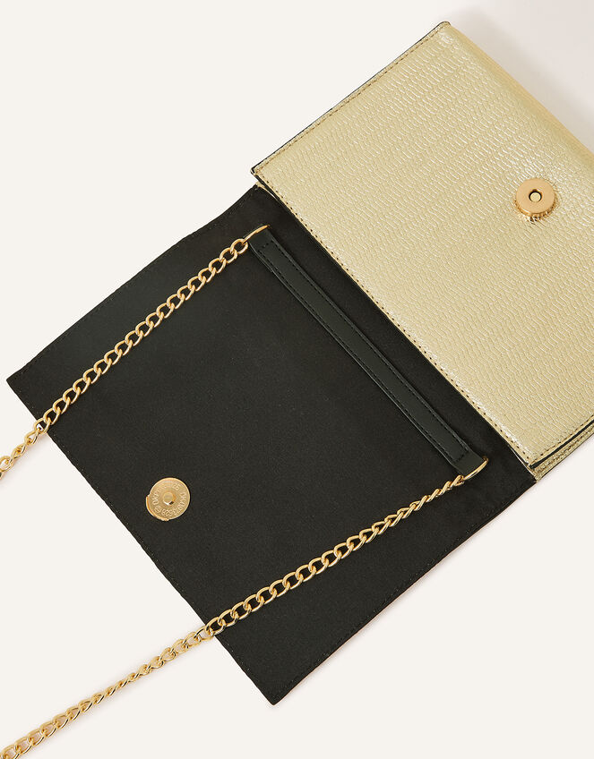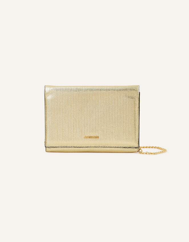 Sleek, structured and shiny, this bag was made with evenings in mind. Designed in metallic faux leather, style it over the shoulder with the chain strap or tuck it inside to wear as a clutch bag. Fastens with a magnetic closure. Gold