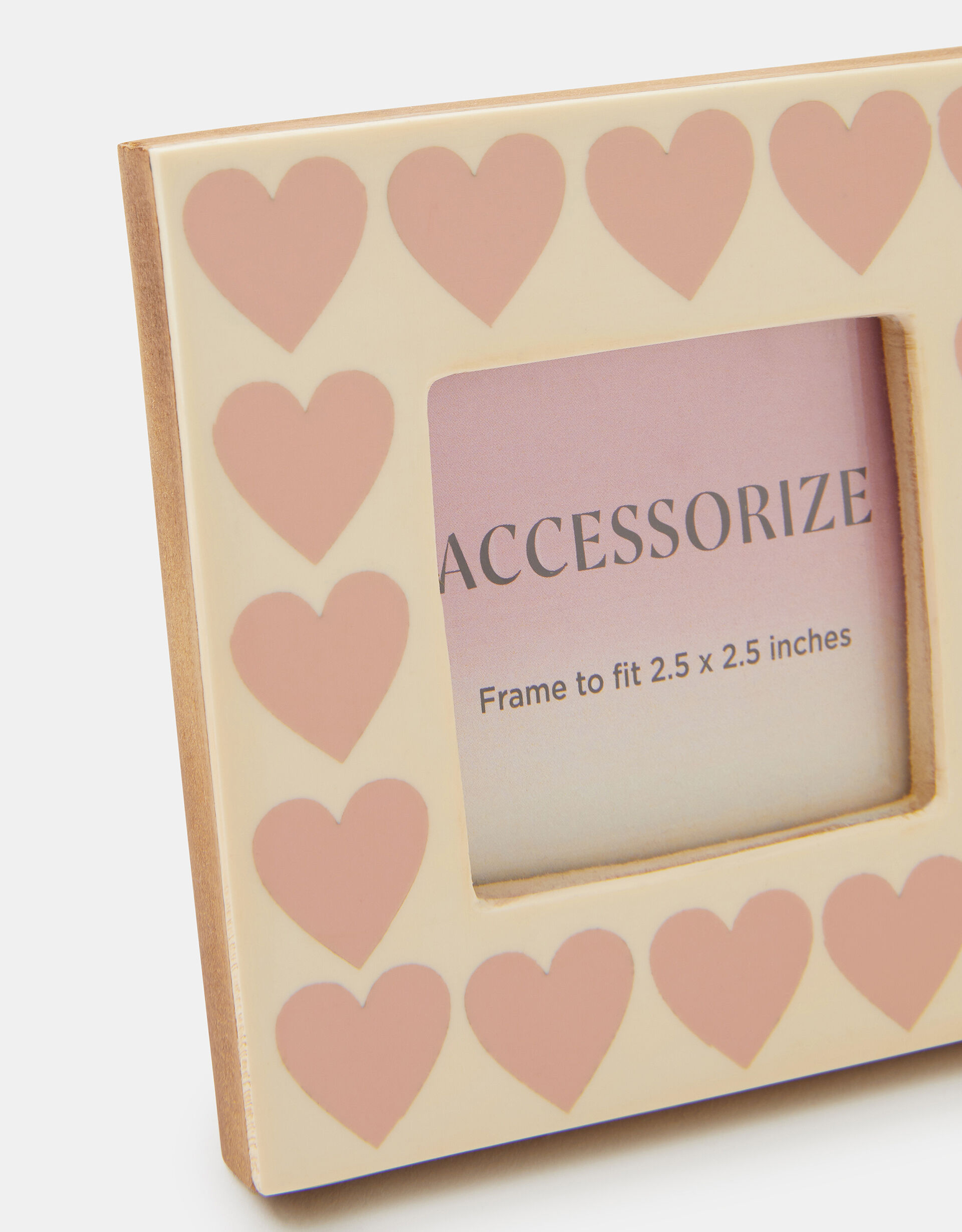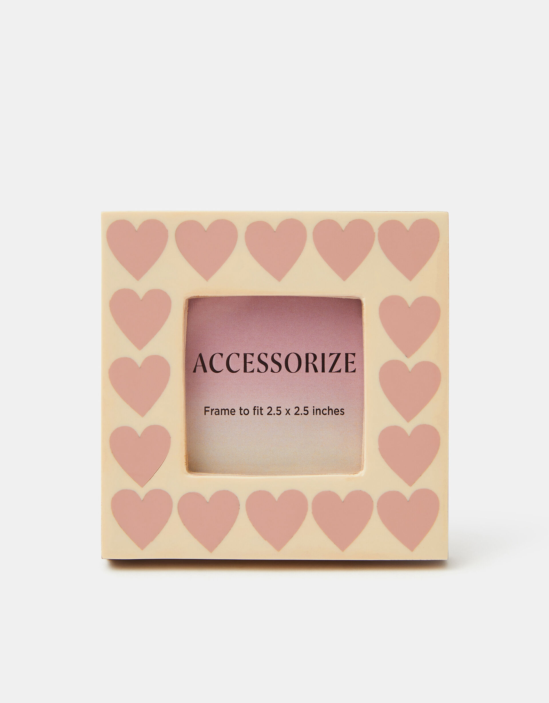 Capture the love and keep it close with this mini photo frame. Made with a wide border covered in pink hearts, place it on your bedside table or shelf. Frame to fit: 2.5 x 2.5 Inches