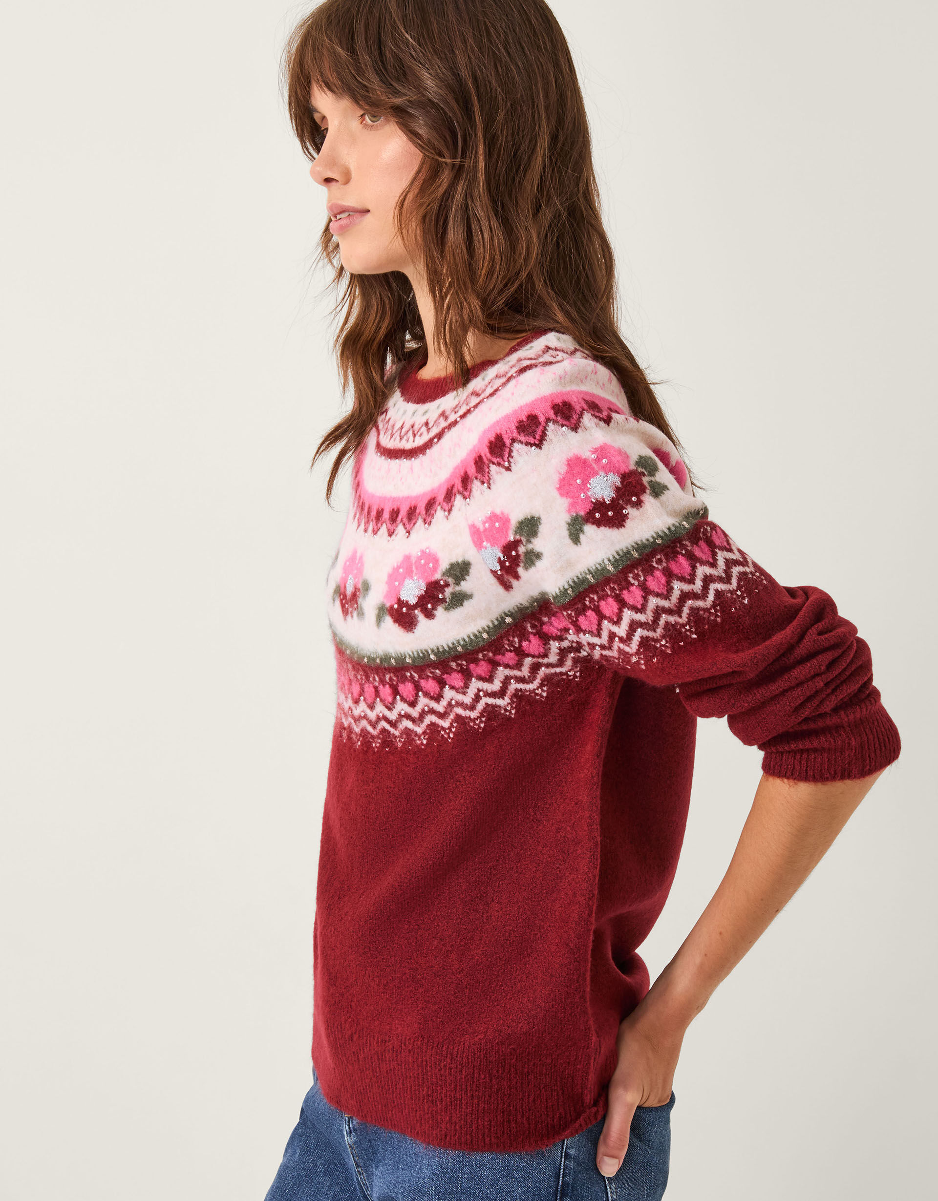 All is fair in love and knitwear. Stitched with a decorative fair isle pattern in an array of pink hues, this jumper is embellished with pearl beads and diamantés for a touch of sparkle. Whether dressing up for December festivities or styling down for a coffee catch up, it’s a cute pick for your winter wardrobe. Red