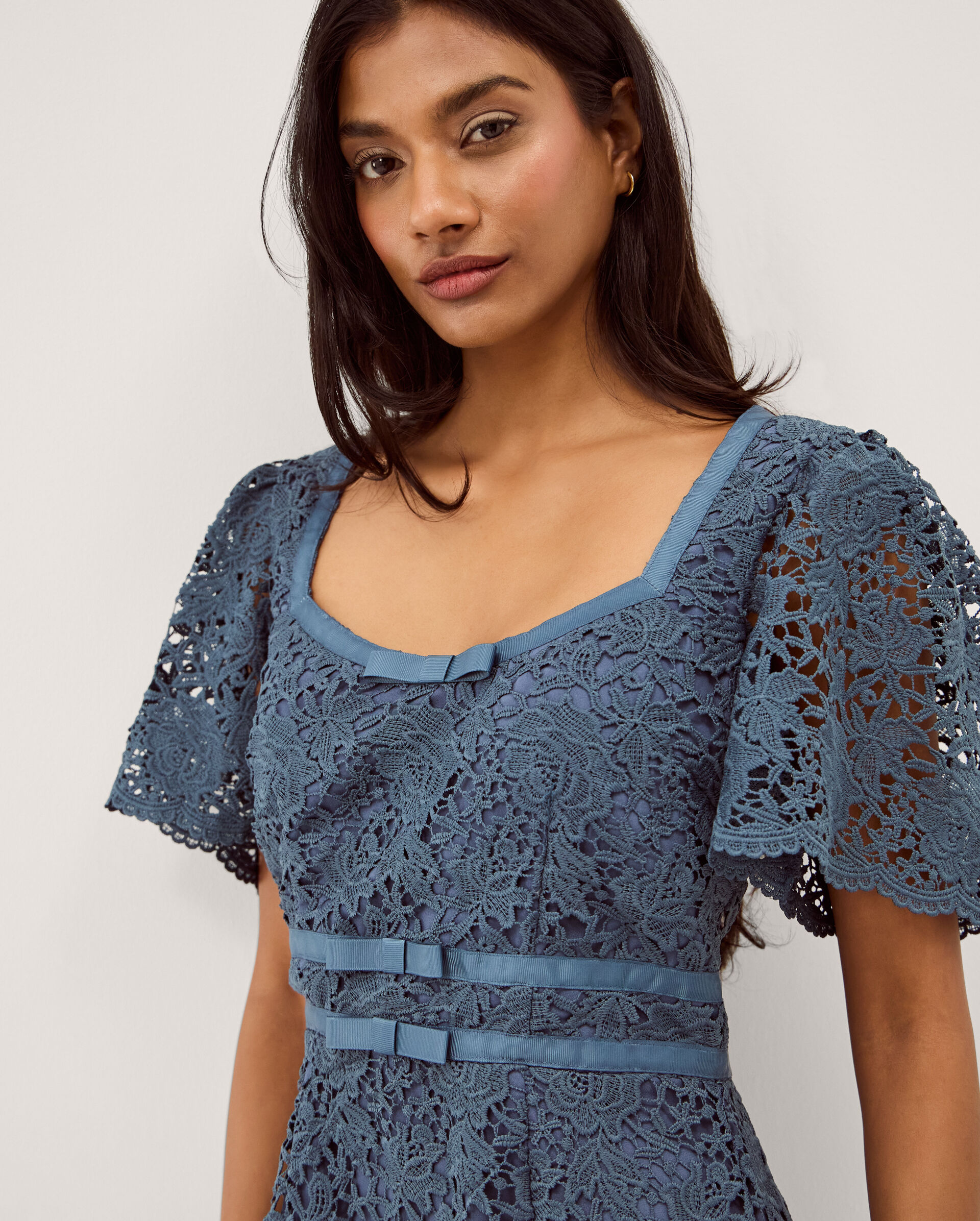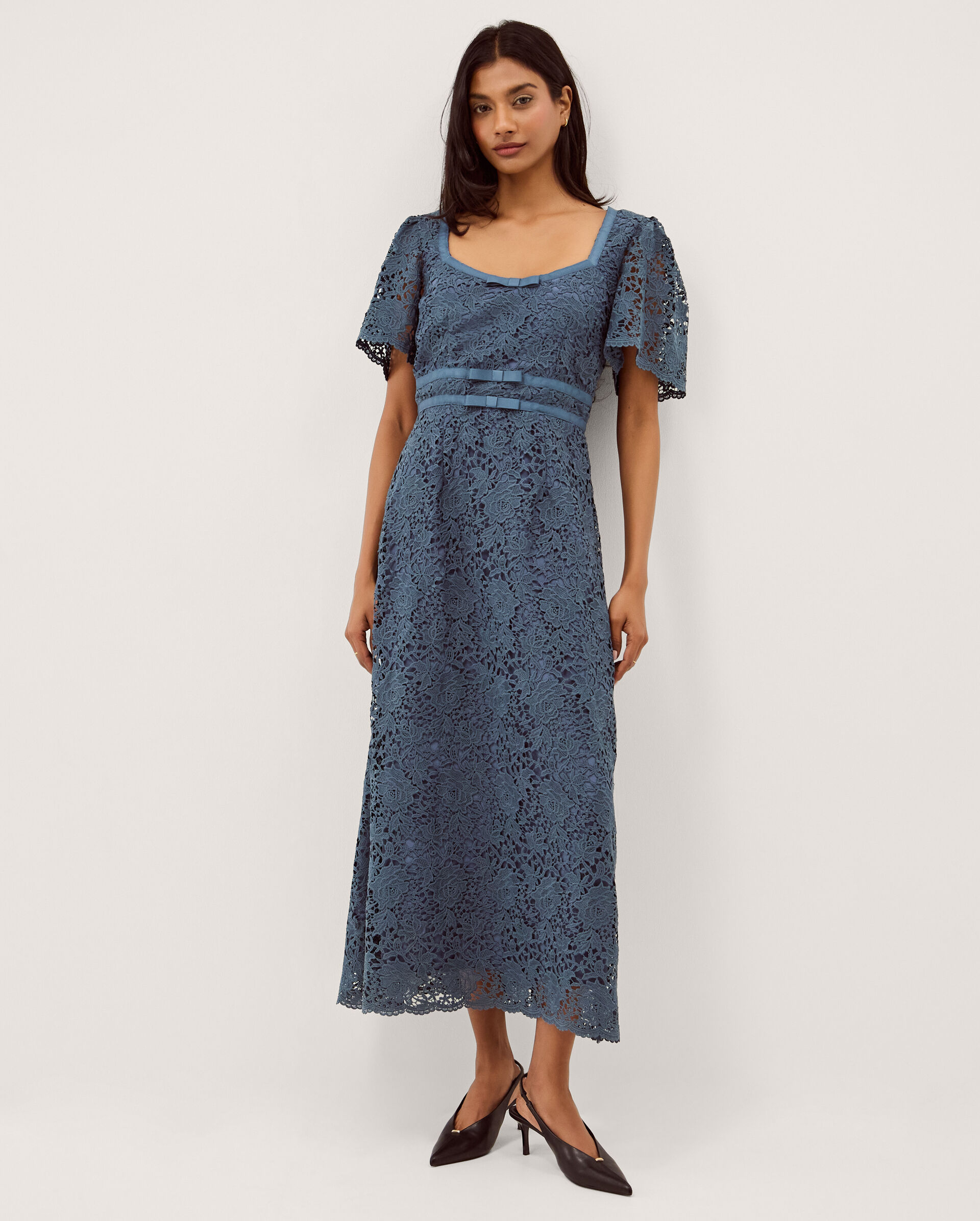 Social butterfly. Designed to wow at every special occasion in your diary, this dress is equal measures timeless and elegant. Cloaked in decorative floral lace, it’s framed with short sleeves and a square neckline, whilst the scalloped hem falls to a perfect calf-skimming length. Blue
