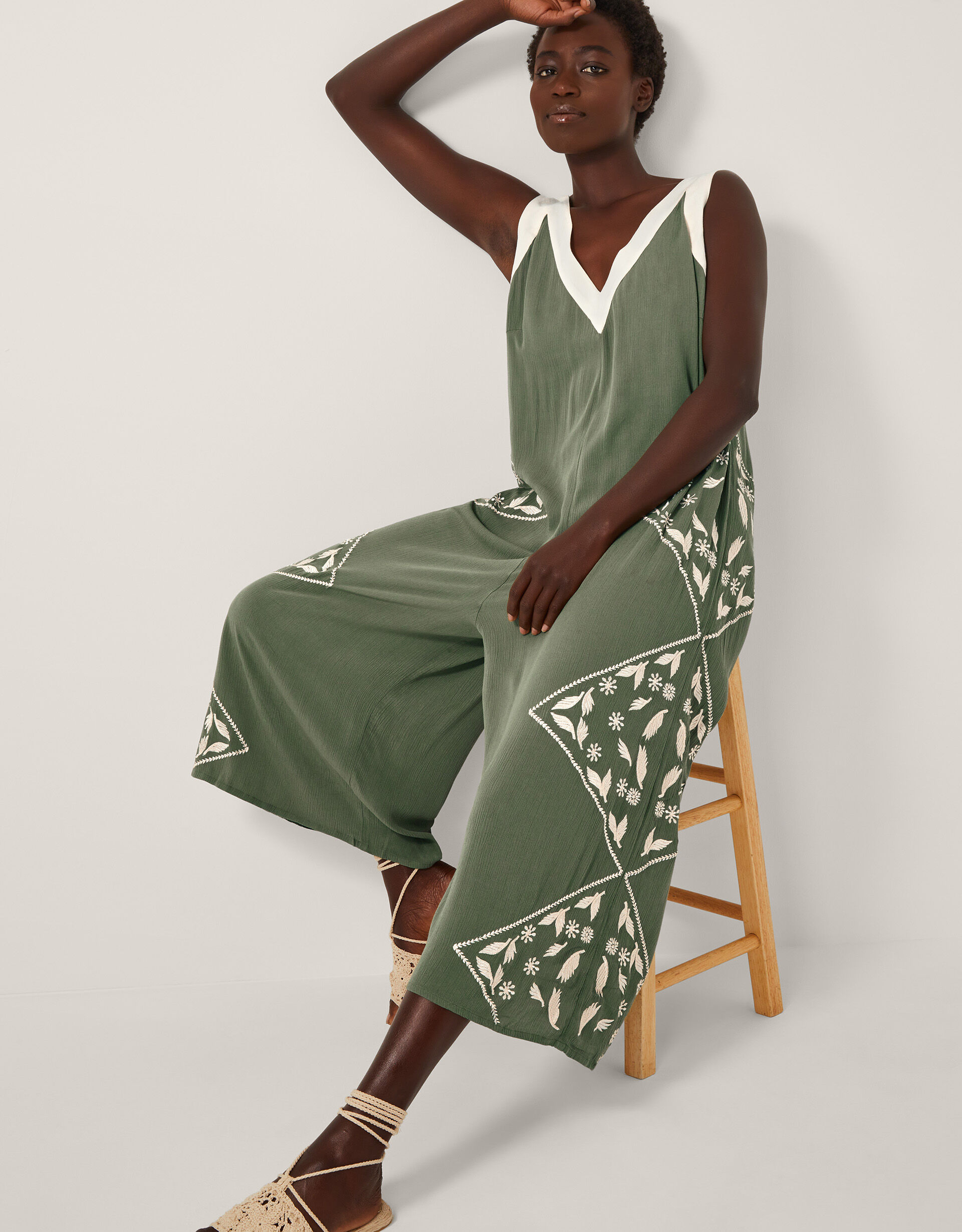 Plenty of leg room. An effortless throw-on-and-go pick for long days spent in the sunshine, this culotte-inspired jumpsuit features a sleeveless v-neckline whilst the crinkled viscose fabric is decorated with intricate flower and leaf embroidery. Complete the look with statement sandals (and SPF)! Green