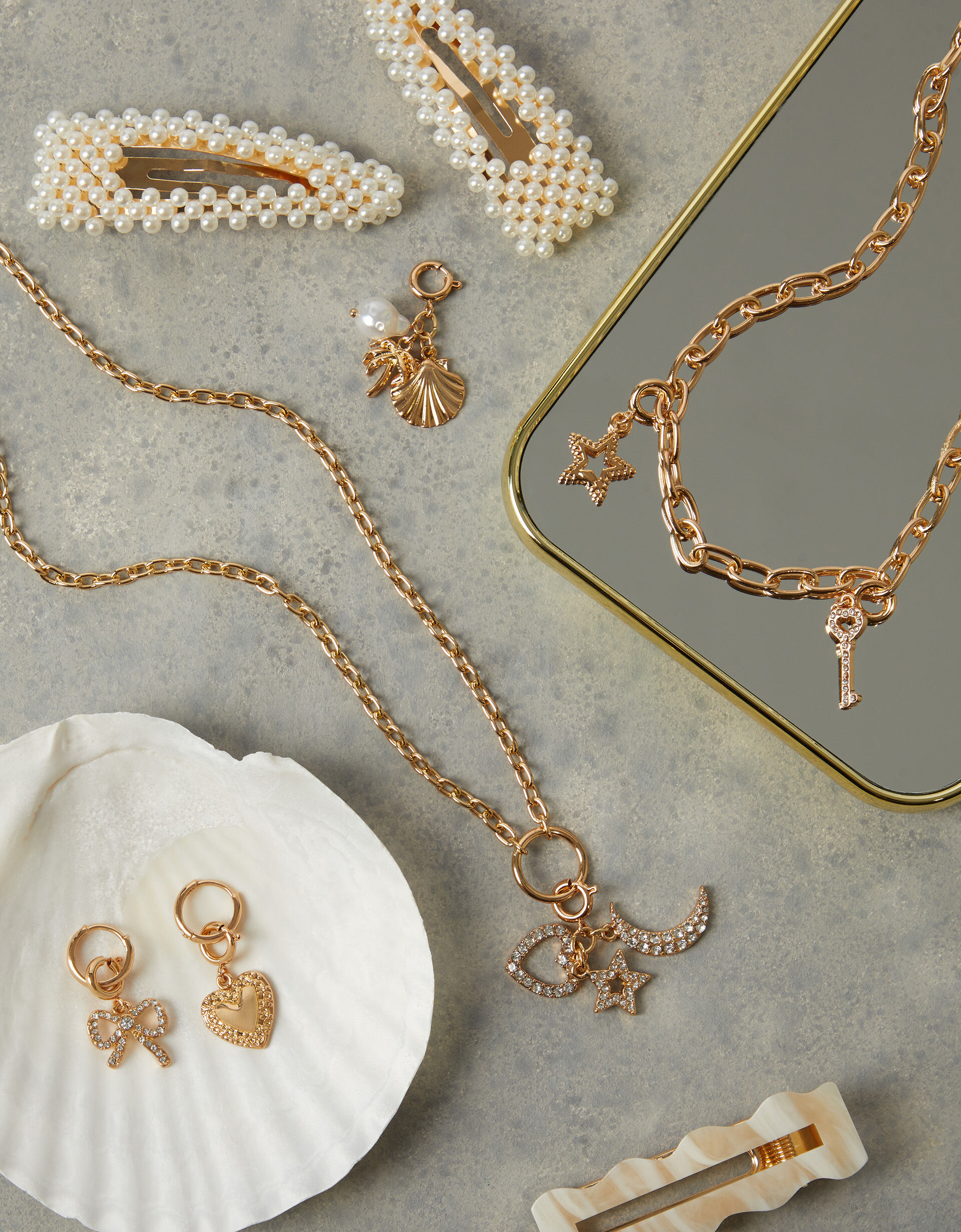 Dipped in a golden tone and designed with a classic link chain, this necklace features a round pendant at the centre, perfect for clipping jewellery charms onto!