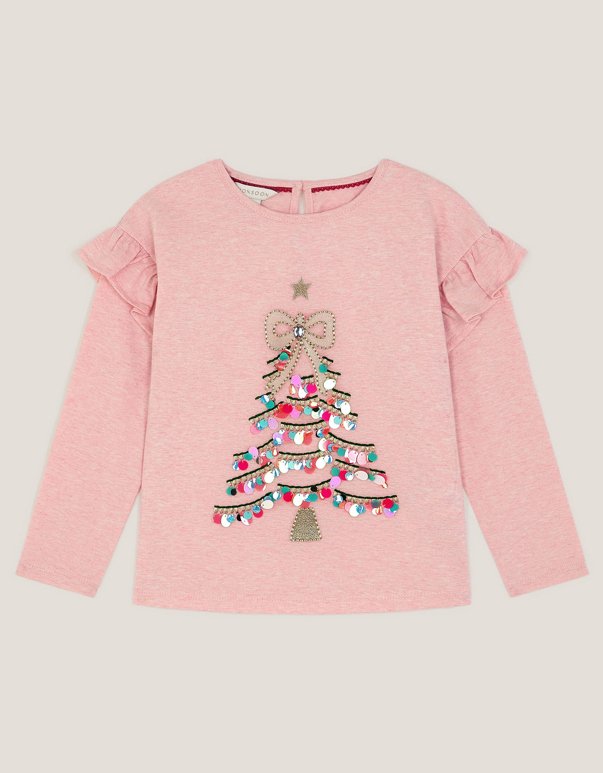 *Twinkles*. Perfect for everyday dressing, this long sleeve top is designed in breathable cotton and features a sparkly Christmas tree motif to the front. Finished with frilly shoulders. Pink