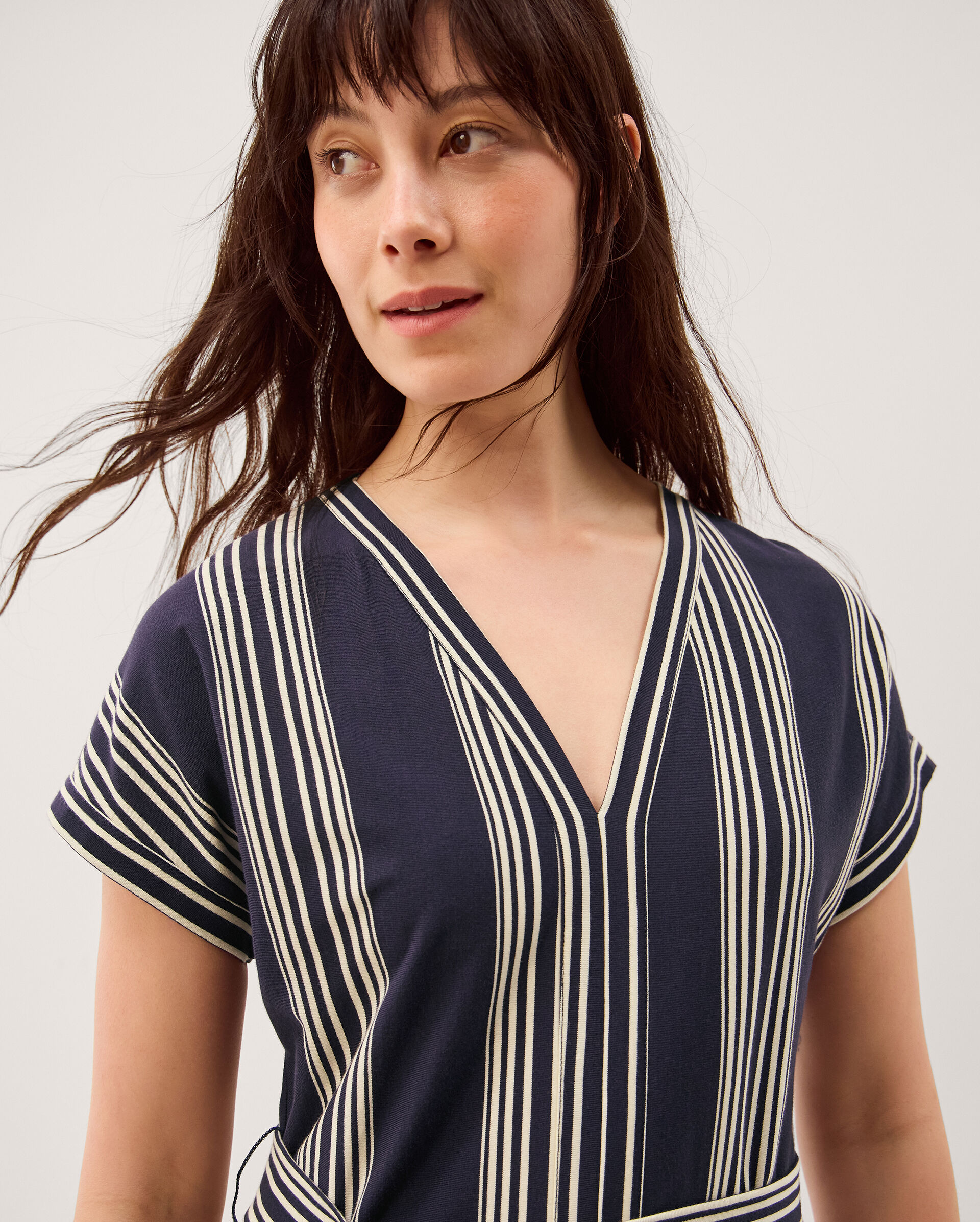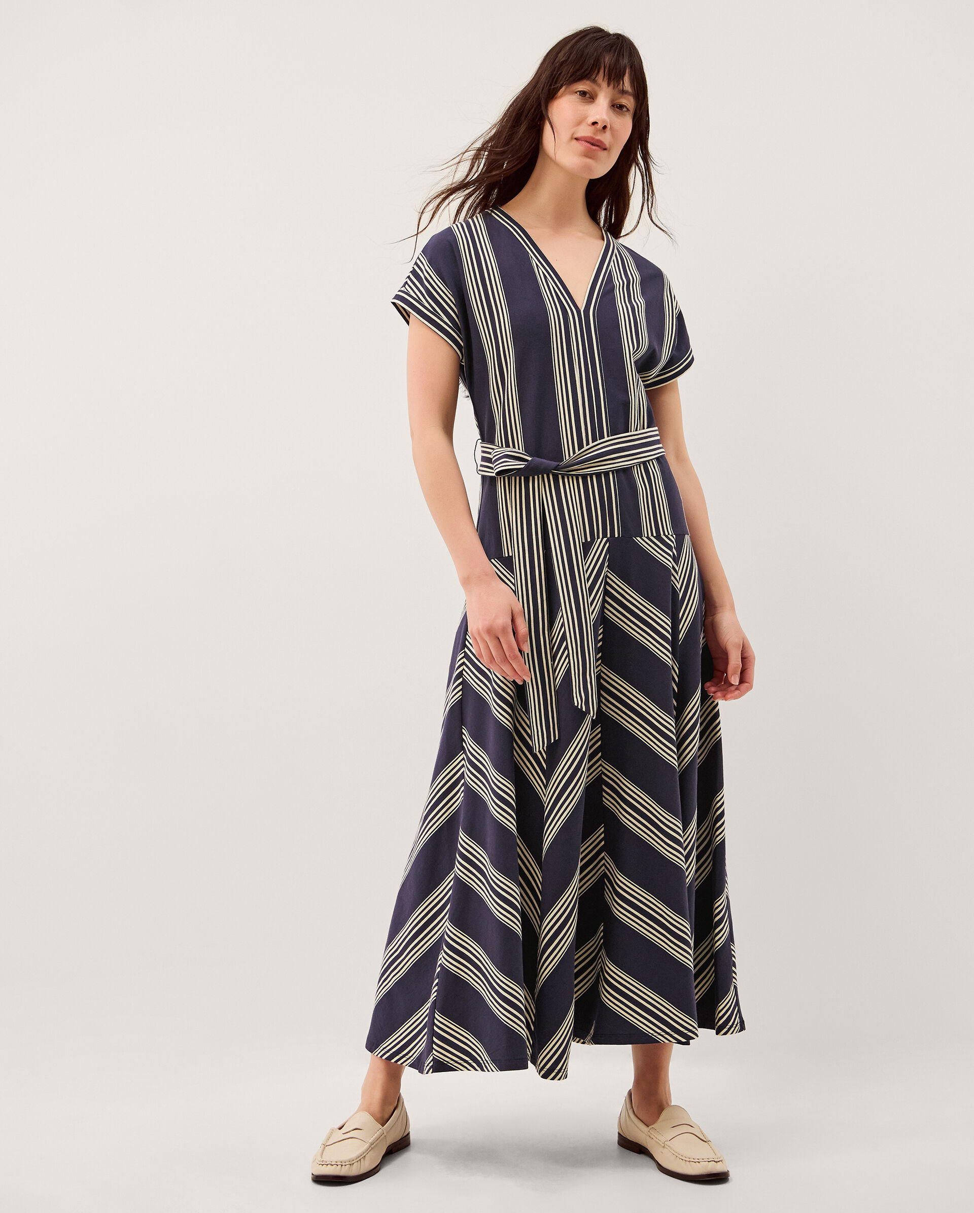 A future favourite. Dipped in a versatile navy hue and patterned with stripes, this maxi dress earns its place in your wardrobe. Designed to give the illusion of a top and long skirt, it can be dressed down with mules and a cardigan or jazzed up with kitten heels and golden accessories. Complete with a tie at the waist. Blue