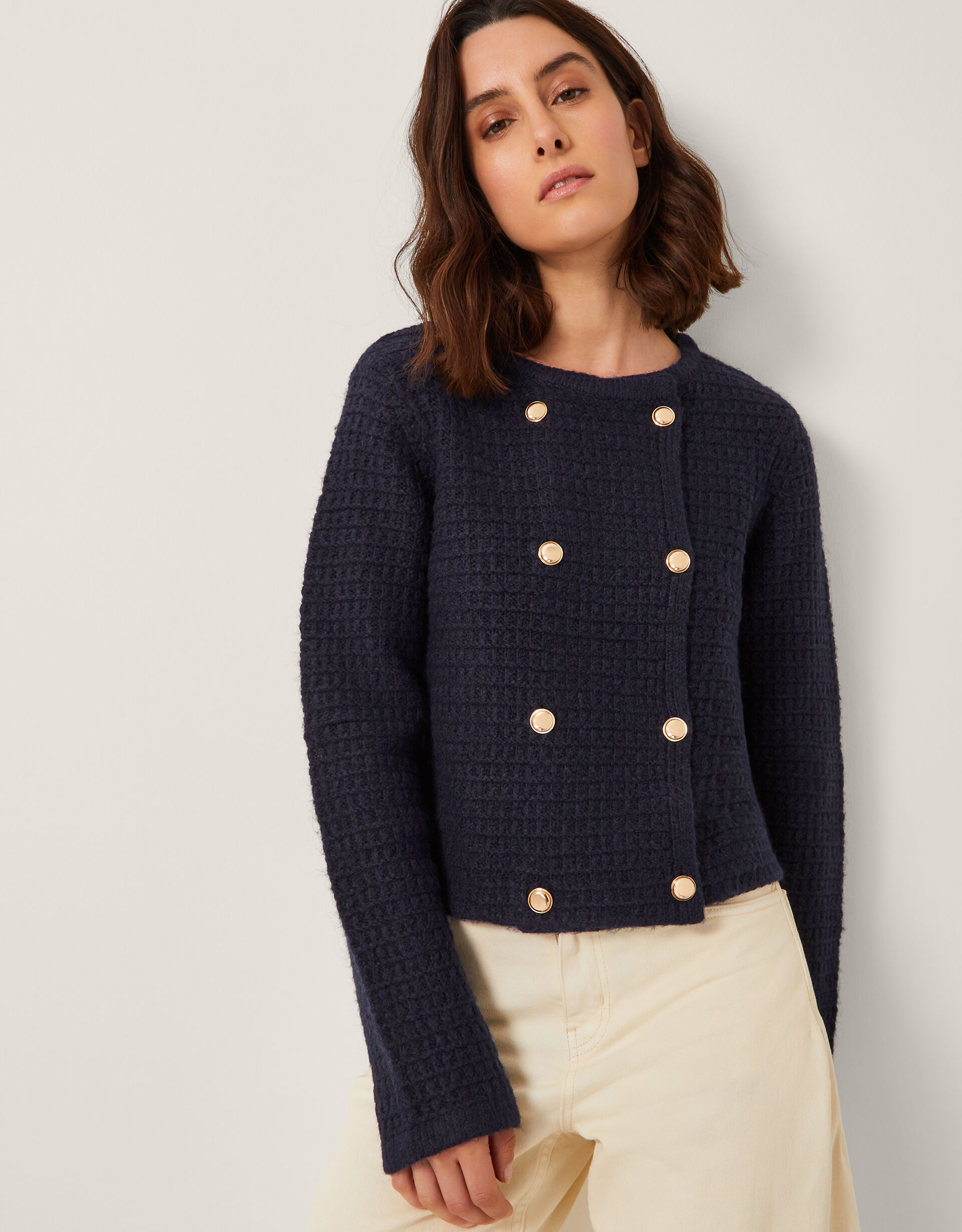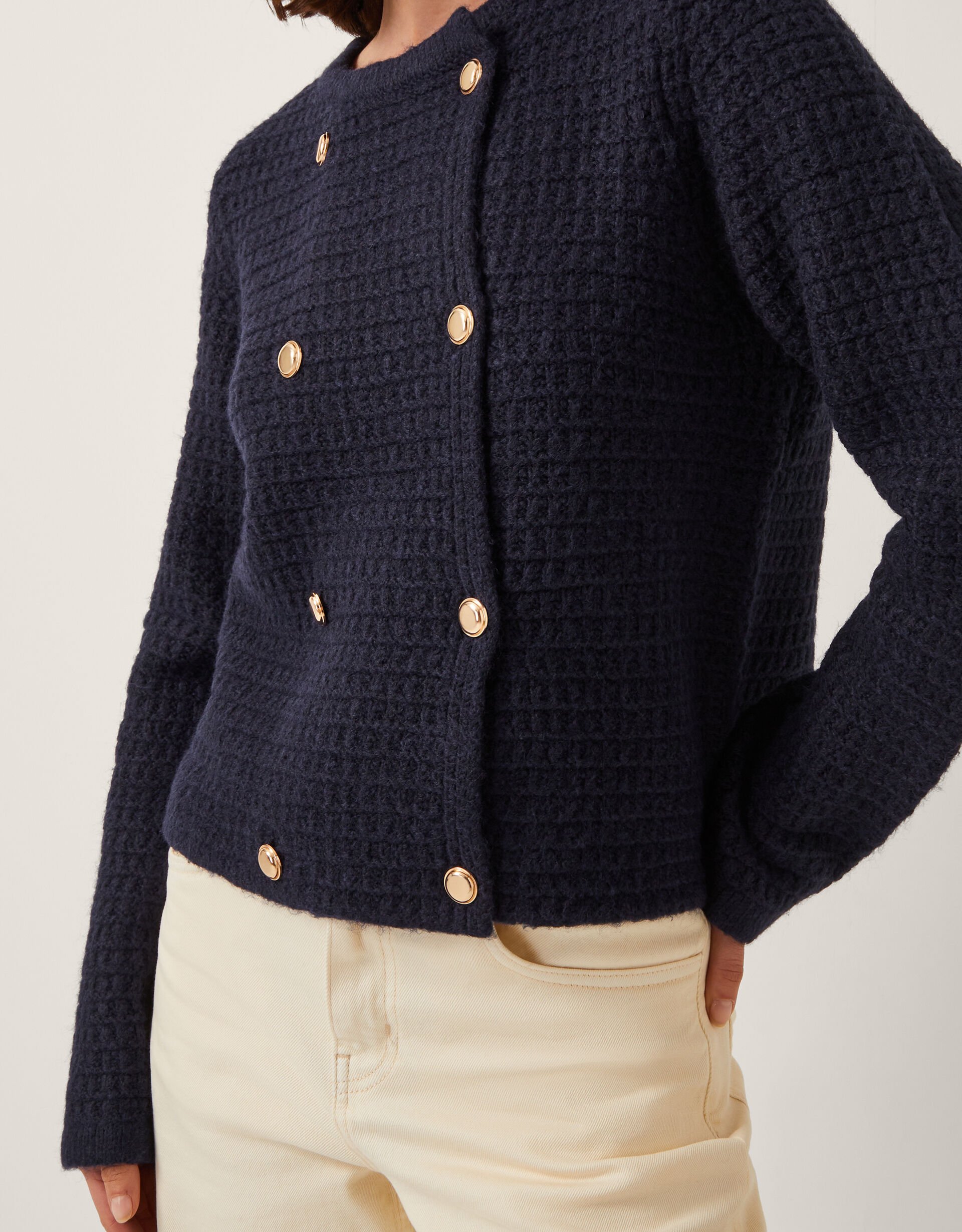 Smart choice. Chic and cosy in equal measure, this cardi is perfect for the office and any social plans at the weekend. Designed with a waffle knit offering a checkered finish, it fastens with golden double-breasted buttons. Blue