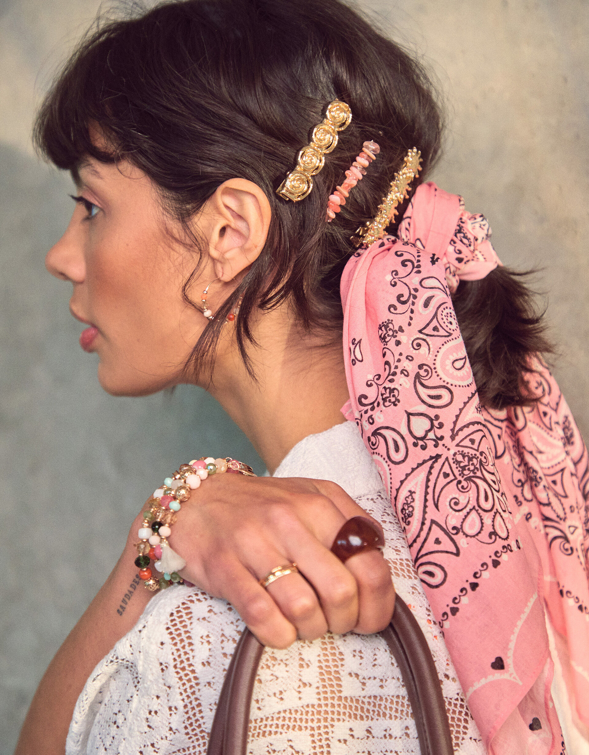 Yeehaw! Add playful, Western-inspired accessories to your outfits with this bandana scarf. It’s designed in pink cotton with classic paisley patterns to finish.
