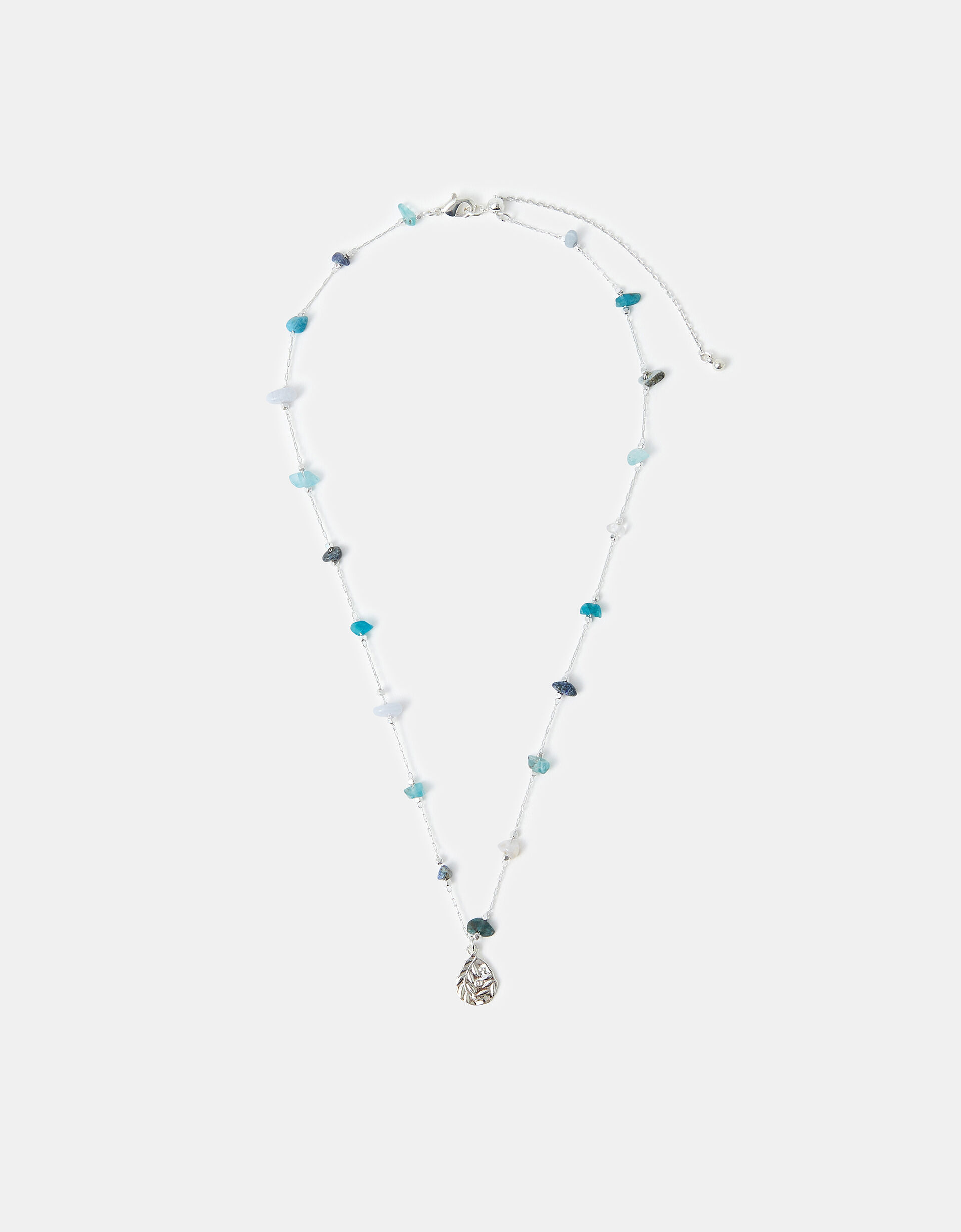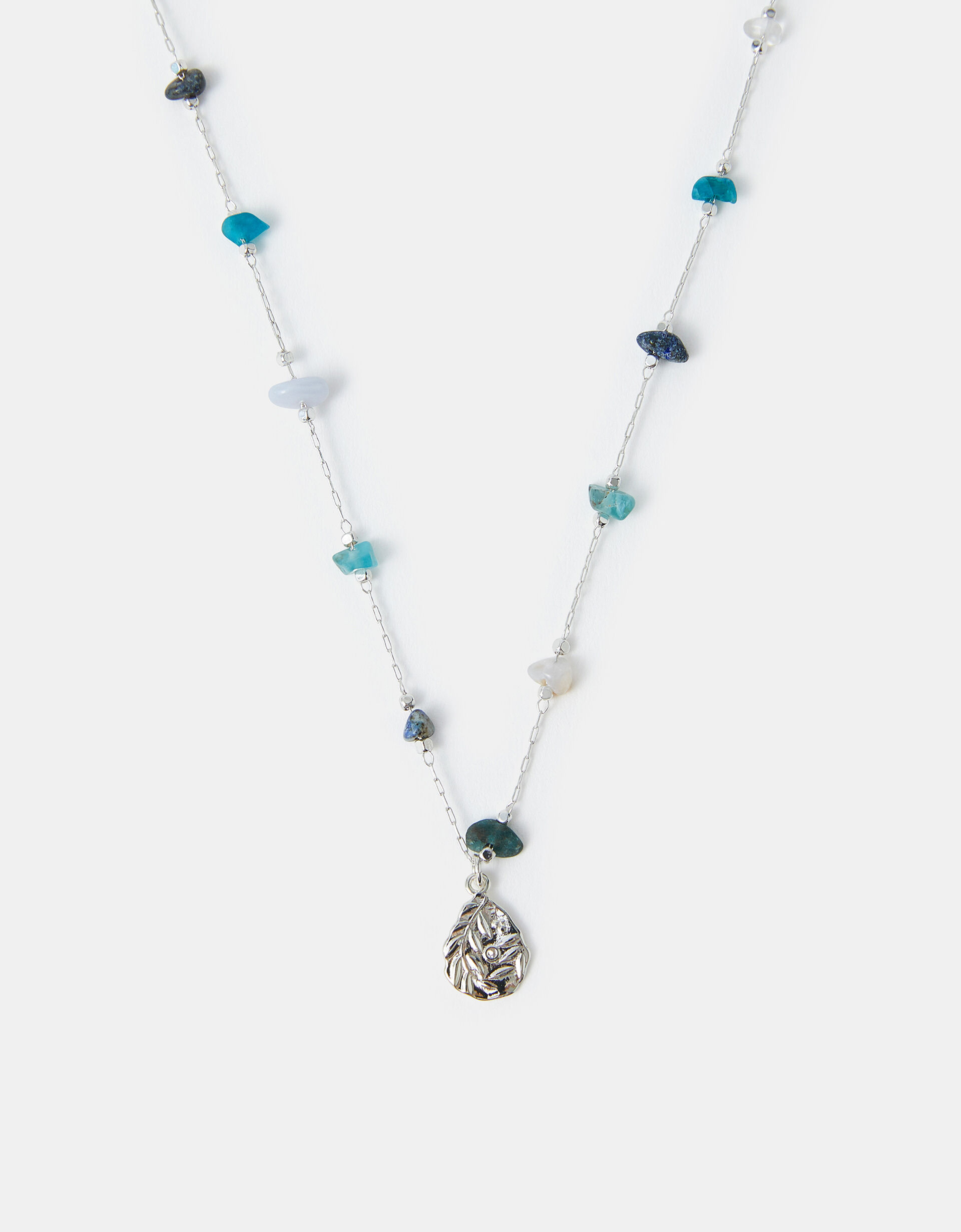 Dipped in sterling silver for a long-lasting finish, this necklace is decorated with evenly-spaced Lapis Lazuli, Labradorite, White Jasper, Apatite, Green Apatite, and Blue Lace Agate semi-precious gemstones. Finished with a molten leaf pendant at the centre, it fastens with a lobster clasp and extender.