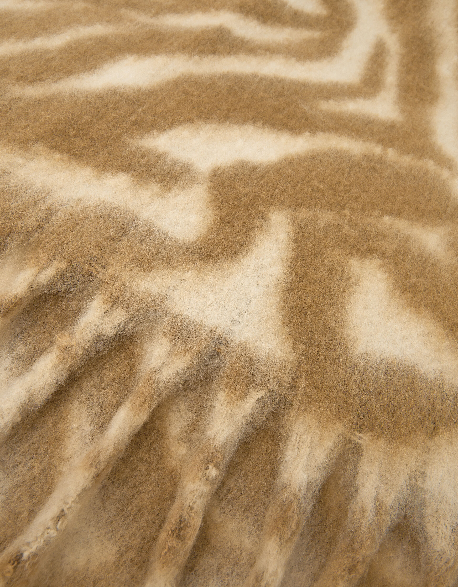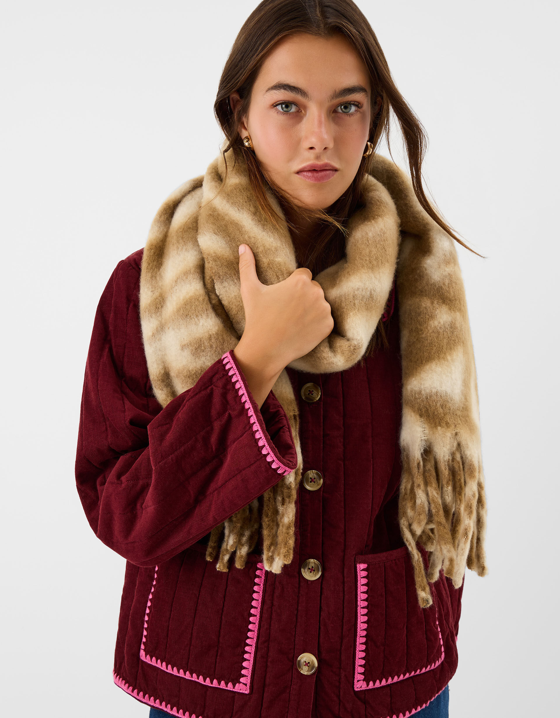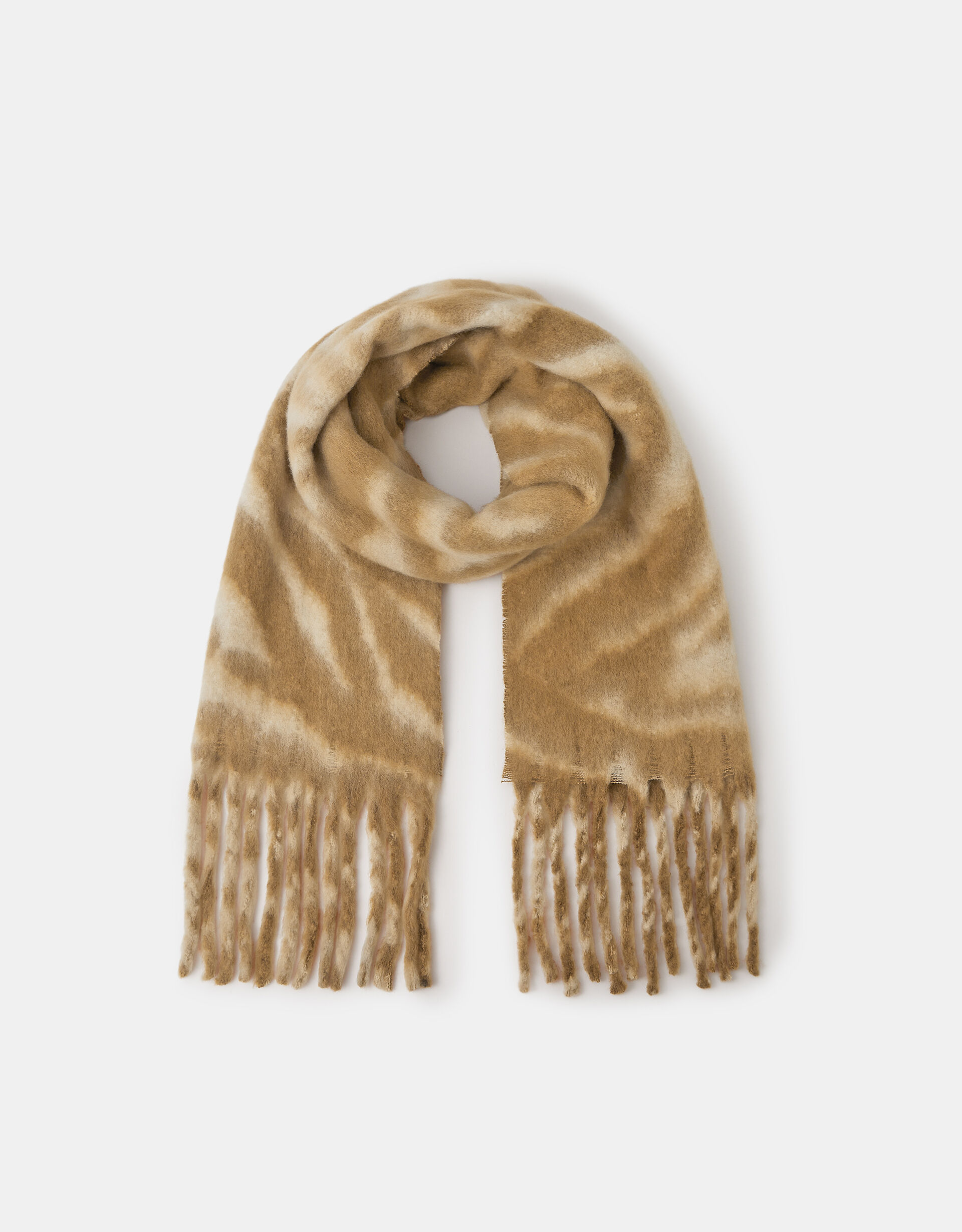 Winter outfit feeling a little flat? Just add stripes! Made from super-soft yarns, this cosy scarf is patterned with tiger stripes in warm, neutral colours.