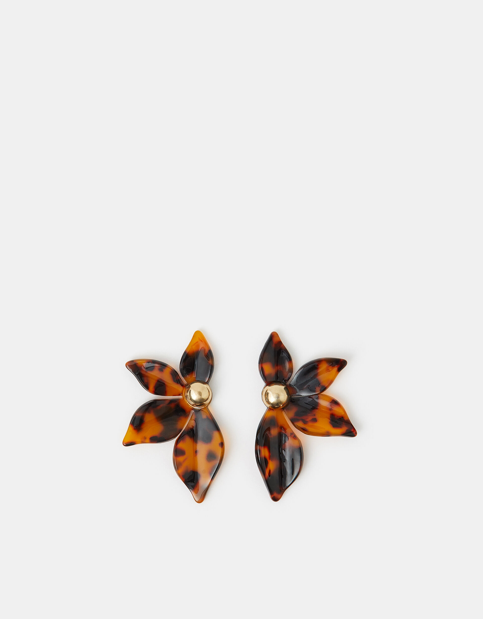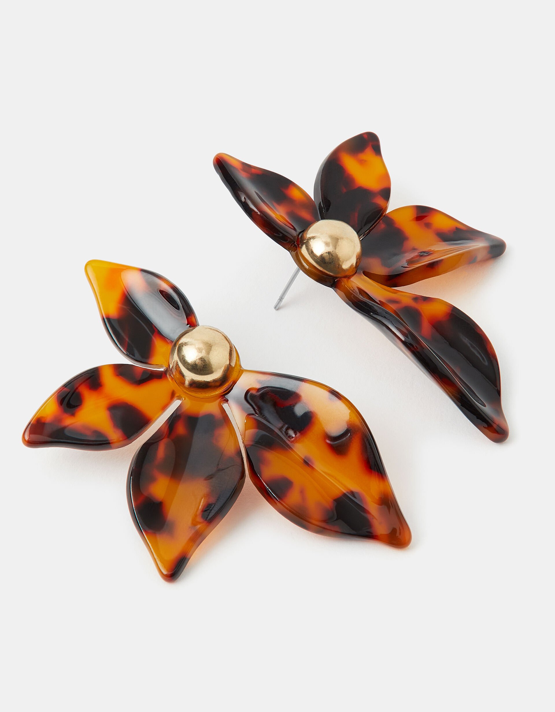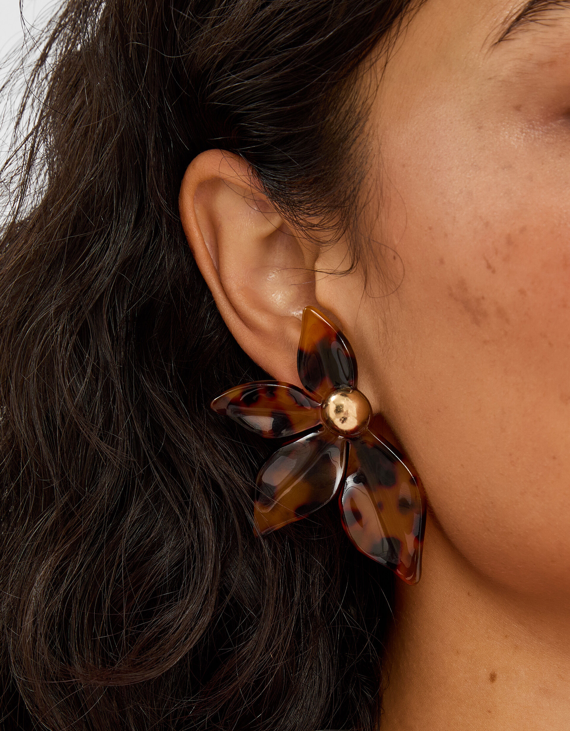 It’s time to make a statement. Designed in a tort resin finish and boasting a unique flower design, these earrings feature a gold stud in the centre. Non-refundable.