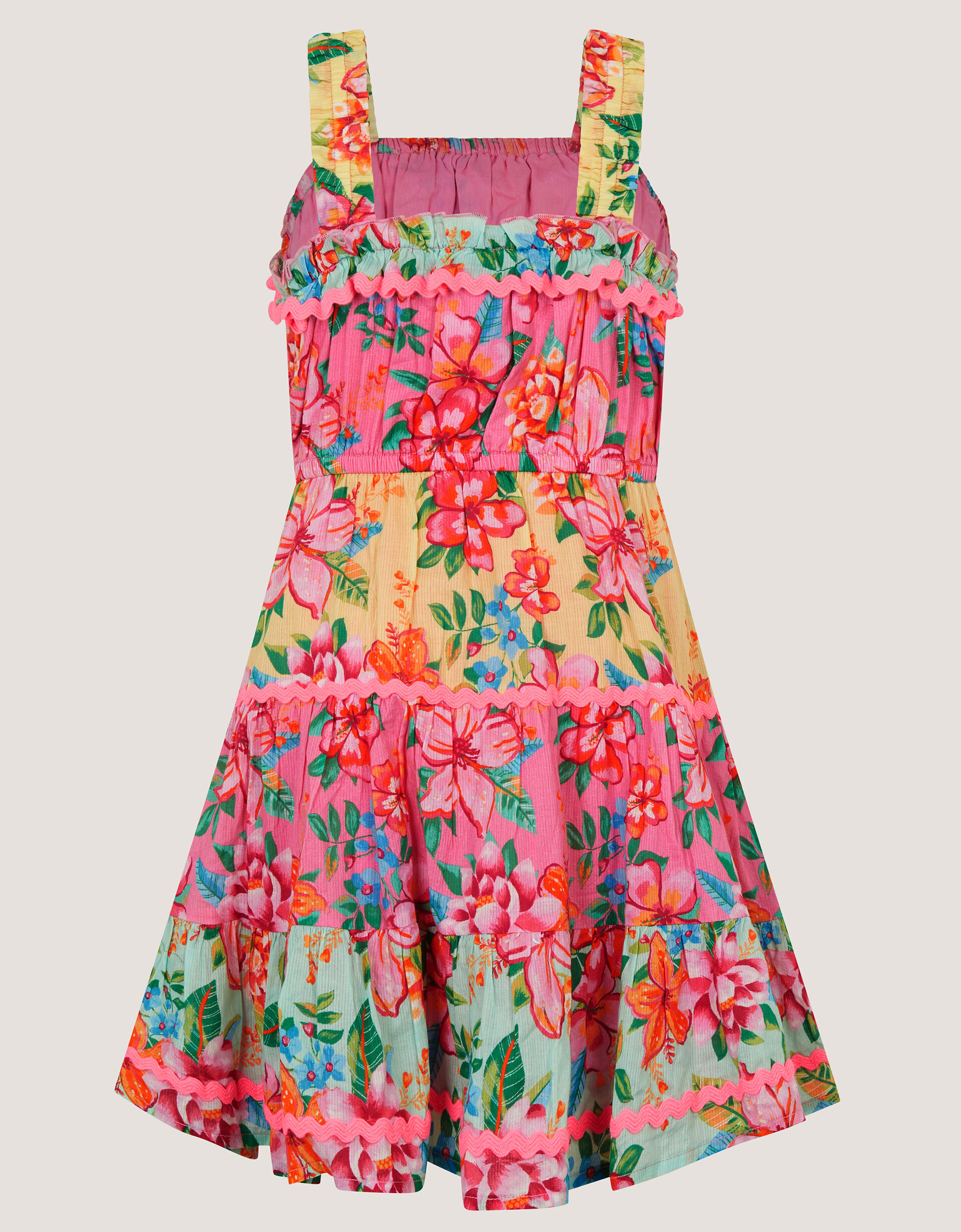 Wanna go on an ice cream run? Patterned with tropical flowers on a vibrant backdrop, this dress is an eye-catching addition to their summer collection. Designed with ric rac detailing throughout, it pairs well with sunnies and sandy toes! Pink