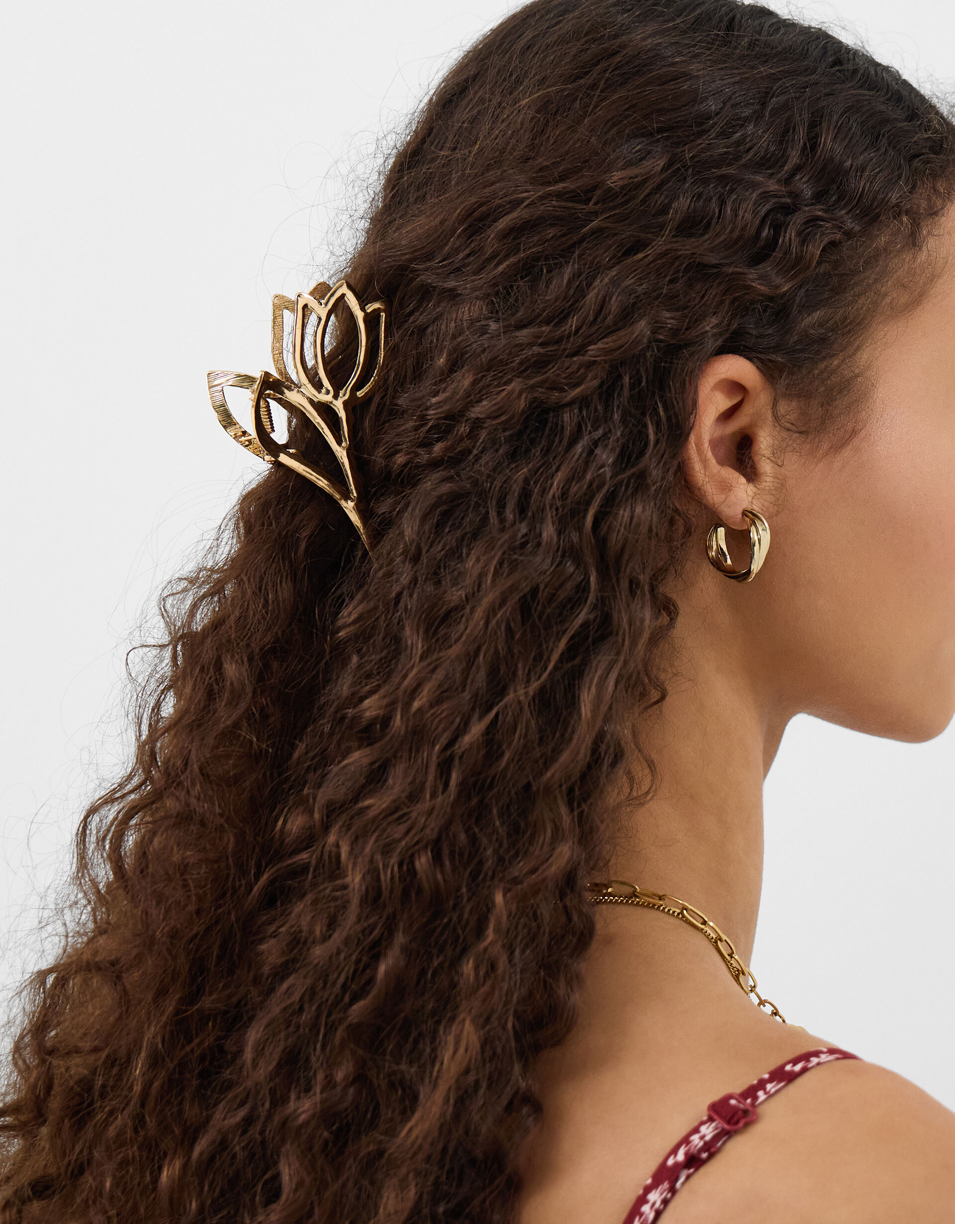 Shaped like a tulip in a gold-tone metal finish, this claw clip will dazzle in your half-up half-down hairstyles. Spring has sprung!