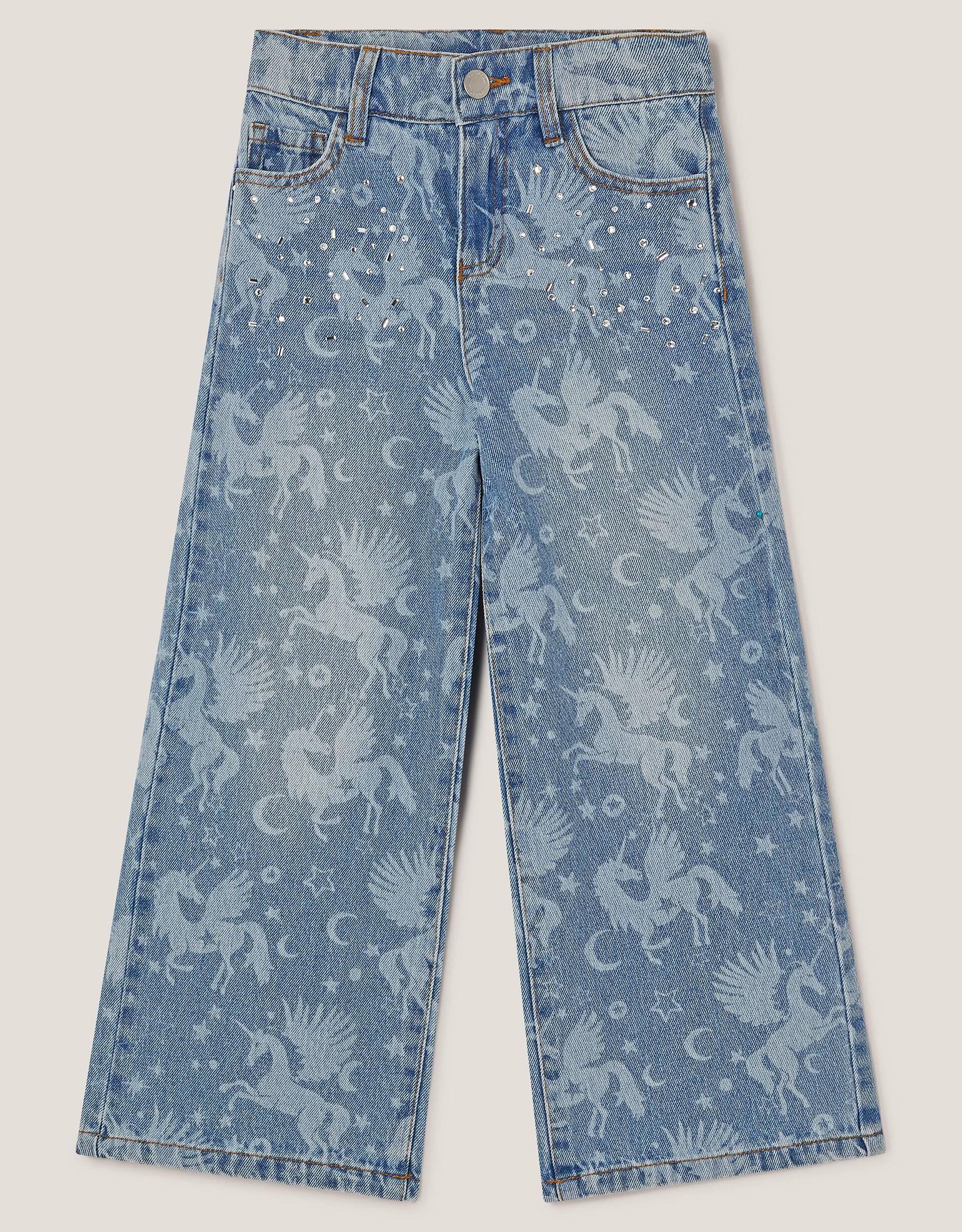 Reach for the stars! Decorated with unicorns, cosmic motifs and sparkly rhinestones, these jeans are a magical addition to their wardrobe. Slung high on the waist, they fall to an easy-breezy wide leg silhouette with a front button and zipper fastening and five-pockets to finish. Blue