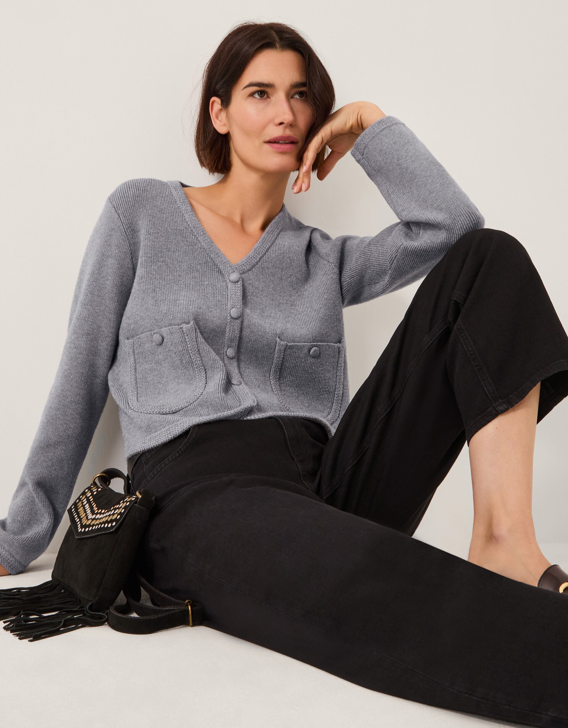 Looks like your high waist jeans have got a new bestie. Designed with a v-neckline and slightly cropped hem, this cardi is a timeless pick for your A/W looks. Finished with patch pockets and front button fastenings. Grey