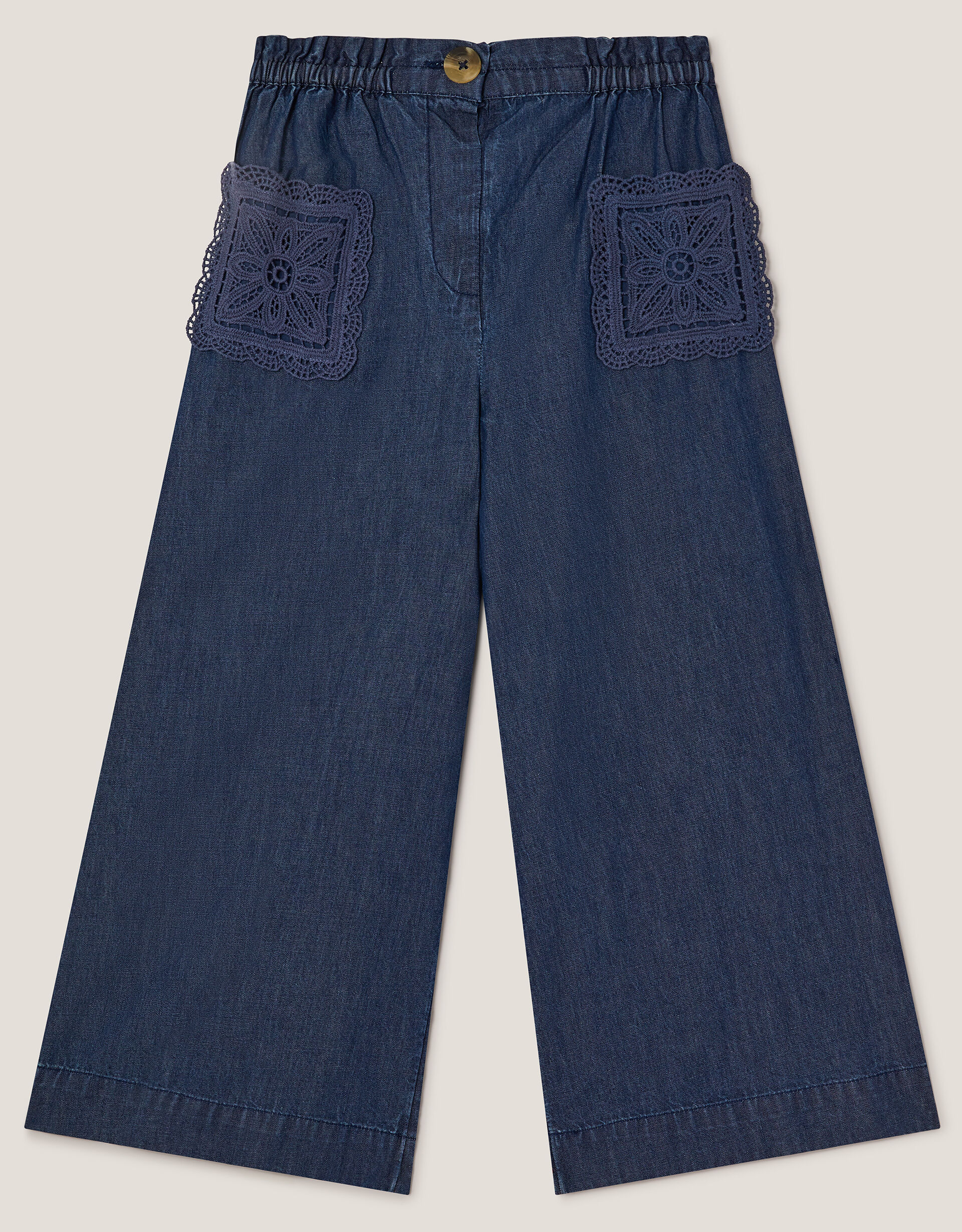 Comfortable and cute. Crafted in lightweight chambray fabric, these stylish wide leg trousers feature crochet detail on the front pockets. Finished with a stretchy waistband. Blue