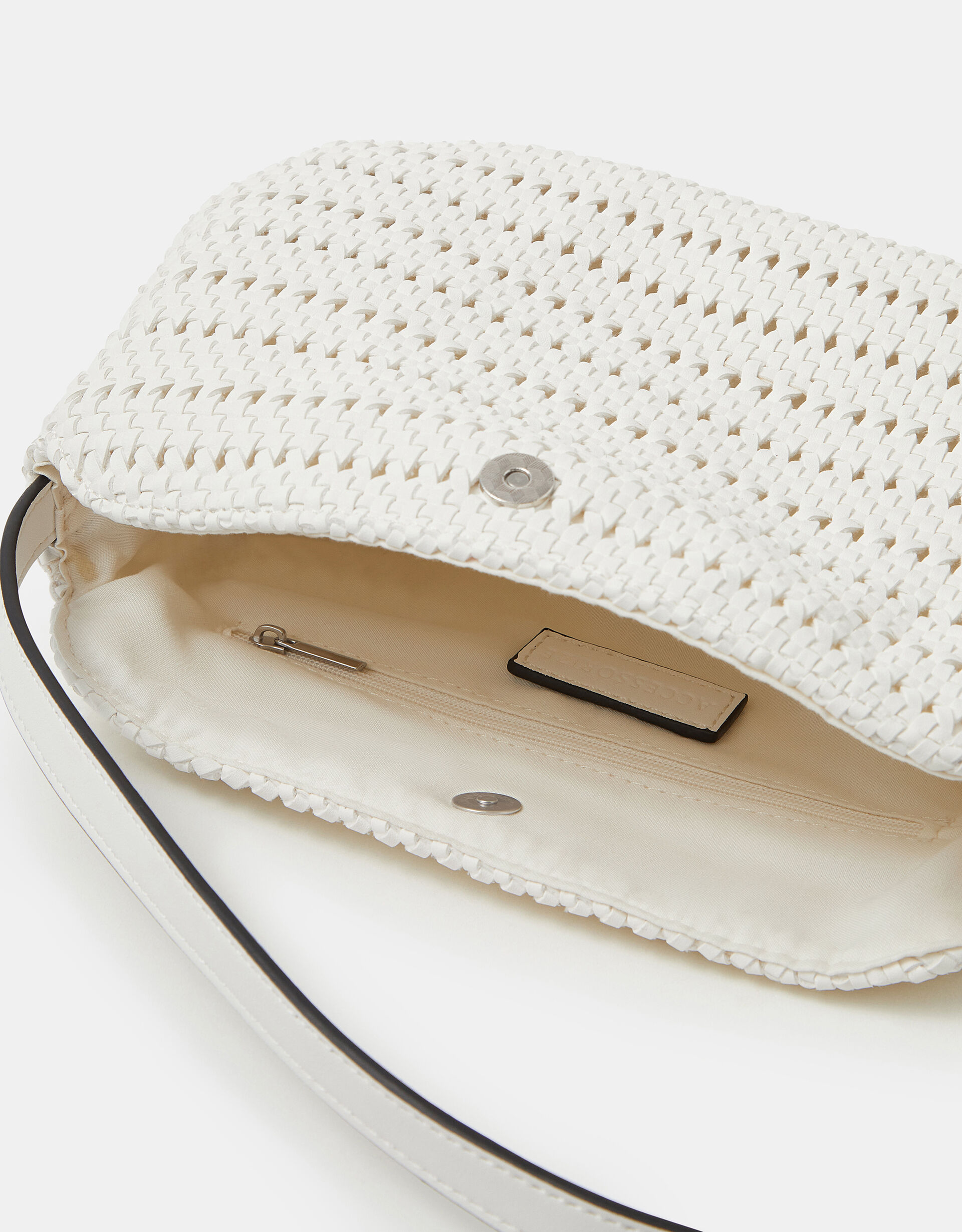 *Insert summer essentials here*. Designed in faux leather with an intricately woven finish, this bag features a fold-top magnetic button fastening and matching flower charm on the adjustable crossbody strap.