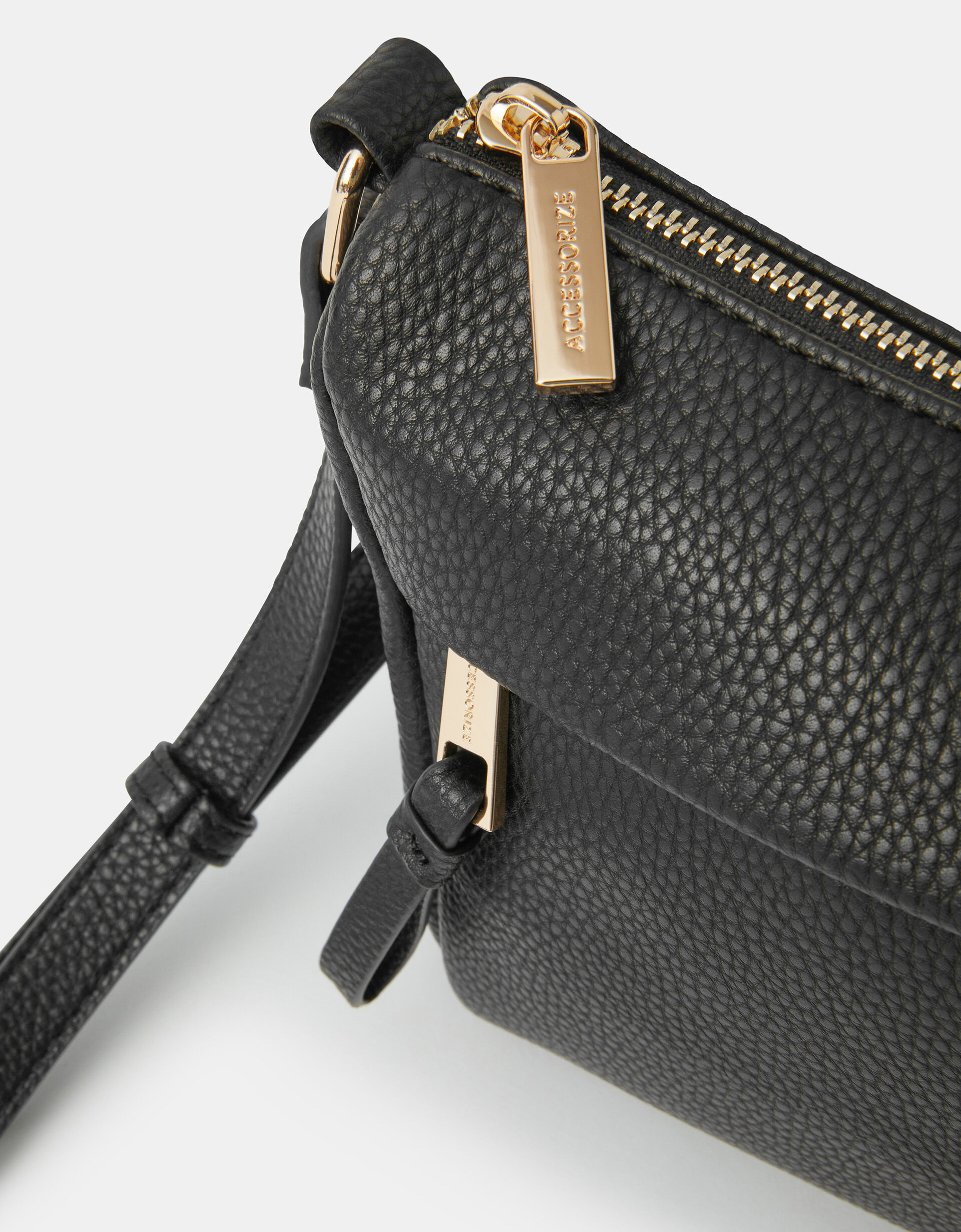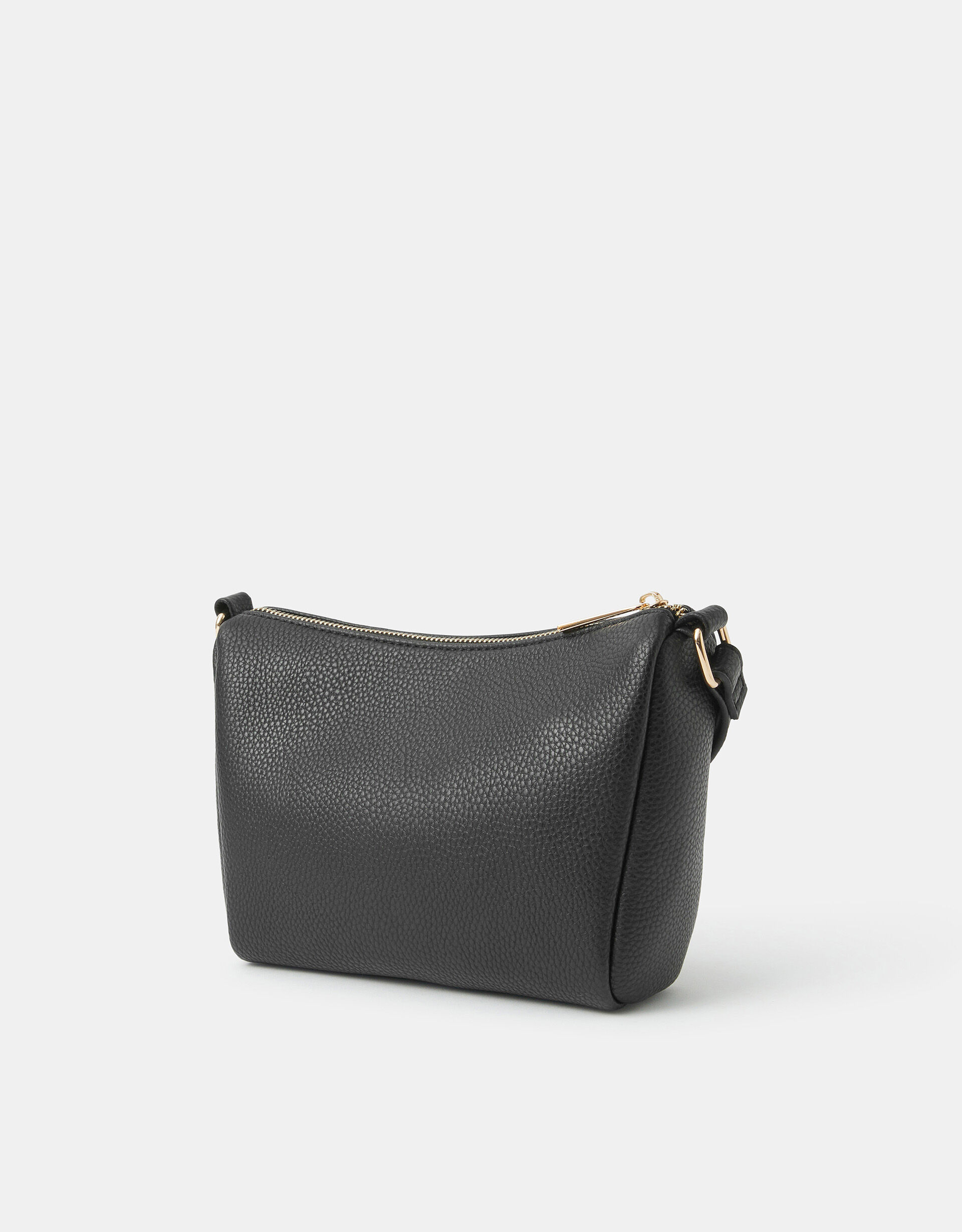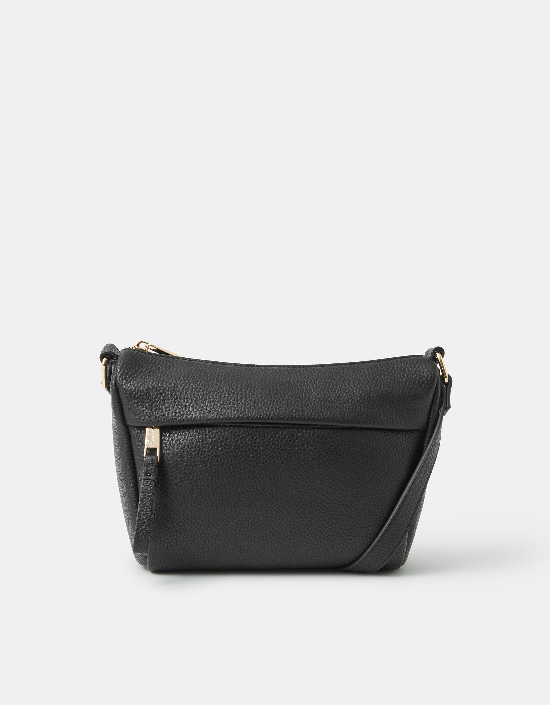 An essential to keep forever. Made from smooth faux leather, this crossbody bag features a main zip compartment, front zip pocket and adjustable strap. Black